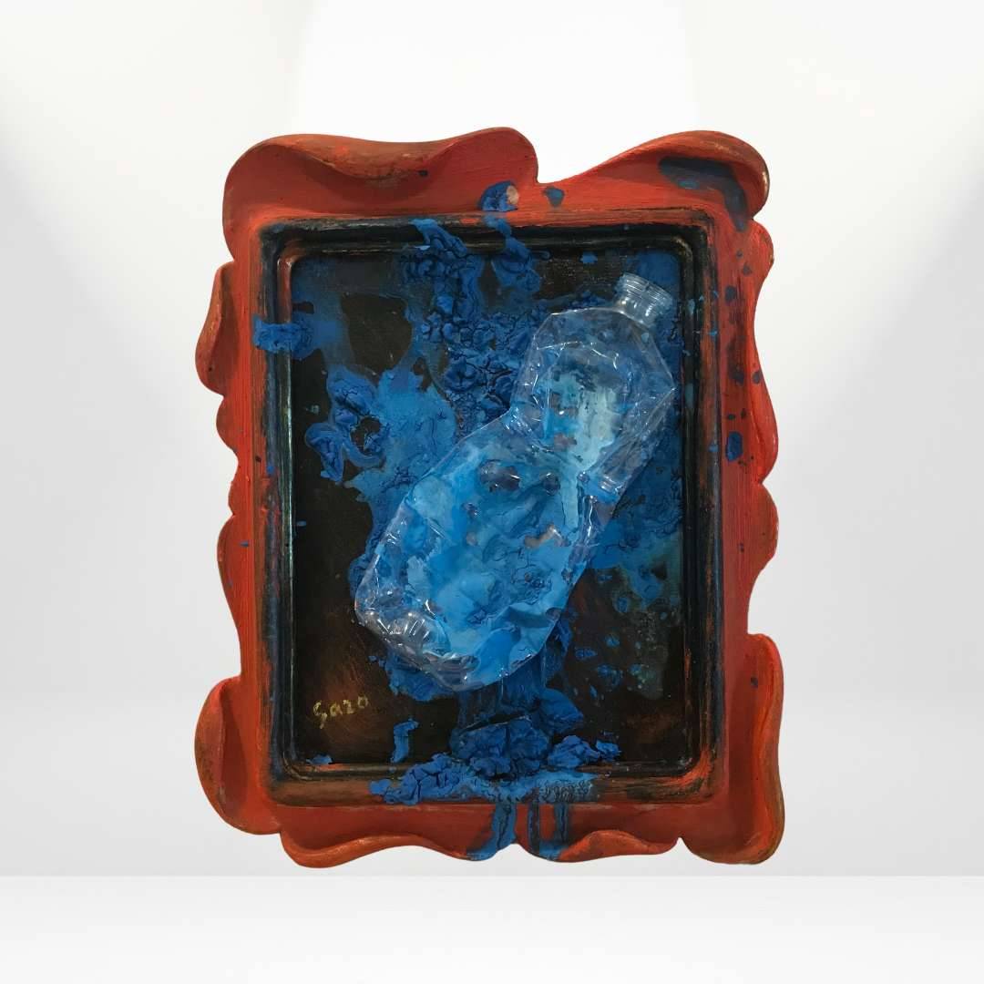 Na obrazie widzimy niecodzienną kompozycję: w centrum uwagi znajduje się plastikowa butelka, która zdaje się dryfować w morzu intensywnie niebieskiej farby. Niebieskie plamy przebiegają chaotycznie po powierzchni, sugerując ruch, jakby żyły własnym życiem. Czerwona, nieco zdeformowana rama otacza to wszystko, tworząc kontrast, który aż krzyczy "popatrz na mnie!". Obraz emanuje atmosferą buntu, jakby chciał pokazać kwestię zanieczyszczenia w artystyczny sposób, ale jednocześnie pozostawiając odbiorcy pole do interpretacji. Styl dzieła jest nieco surrealistyczny, przypominając abstrakcyjne płótna, ale z wyraźnym przesłaniem. Użycie jaskrawych kolorów oraz technika rozlania farby nadają obrazowi szorstki charakter, jakby artysta chciał zaznaczyć swoistą „dirty reality”. Patrząc na to dzieło, można poczuć nutę frustracji i refleksji nad naszym wpływem na środowisko. Dla mnie to trochę jak krzyk współczesnego świata przeciwko nieświadomości ekologicznej. Dziecko powiedziałoby "O, butelka robi sobie farbowaną kąpiel!". Taka reakcja przywodzi na myśl niewinność w zderzeniu z poważnym tematem. Szczerze mówiąc, patrząc na ten obraz, czuję mieszankę zadumy i determinacji. To jak "wake-up call" do działania, bo przecież inaczej ta piękna Ziemia zginie.