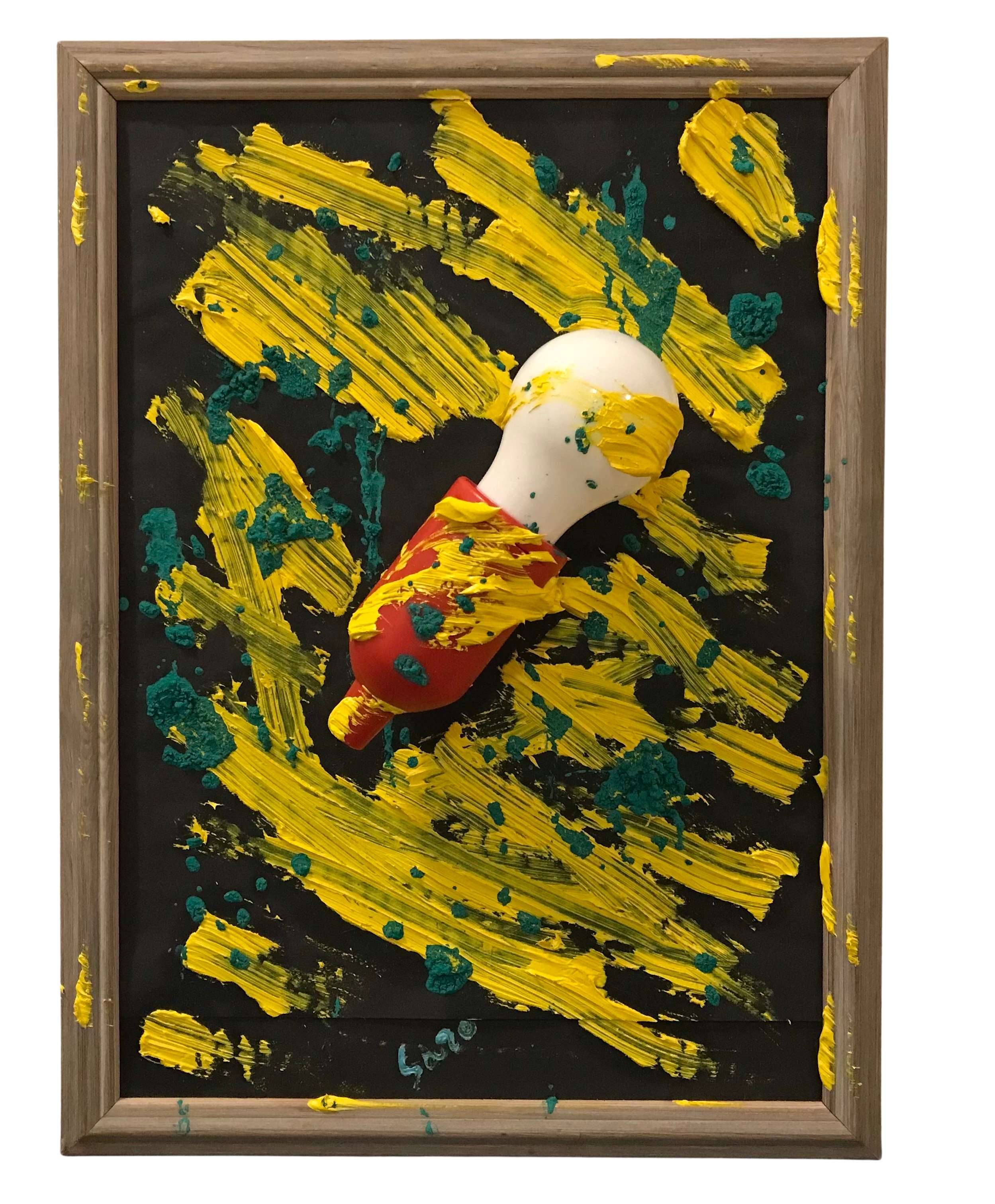 Obraz przykuwa uwagę grą kontrastów i dynamiczną kompozycją. Dominują tu intensywne żółcie smagające czarne tło jak słoneczne eksplozje, przeplatane gdzieniegdzie kropelkami turkusu. Centralnym punktem jest wyrastająca z płótna forma przypominająca żarówkę w czerwonej osłonie. To nadaje całości trójwymiarowości, sprawiając, że nie tylko patrzymy, ale czujemy ten impakt. Wow, to wygląda jak mały wybuch farb! Atmosfera dzieła jest żywiołowa i pełna energii, niemalże elektryzująca, co może budzić u odbiorcy poczucie niepokoju, ale i fascynacji. Ma się wrażenie, jakby artysta włożył w to płótno całą swoją pasję i odrobinę szaleństwa. Technika użyta przez twórcę to prawdopodobnie impast, gdzie grube warstwy farby modelują przestrzeń, czyniąc obraz niemalże dotykalnym. Ciekawie, jakby patrzeć, jak czaszka w pop-art stylu zanurza się w chaosie kolorów. W melancholijnej zadumie nad tą artystyczną eksplozją można się zatracić, dając się ponieść fantazji i osobistym interpretacjom.