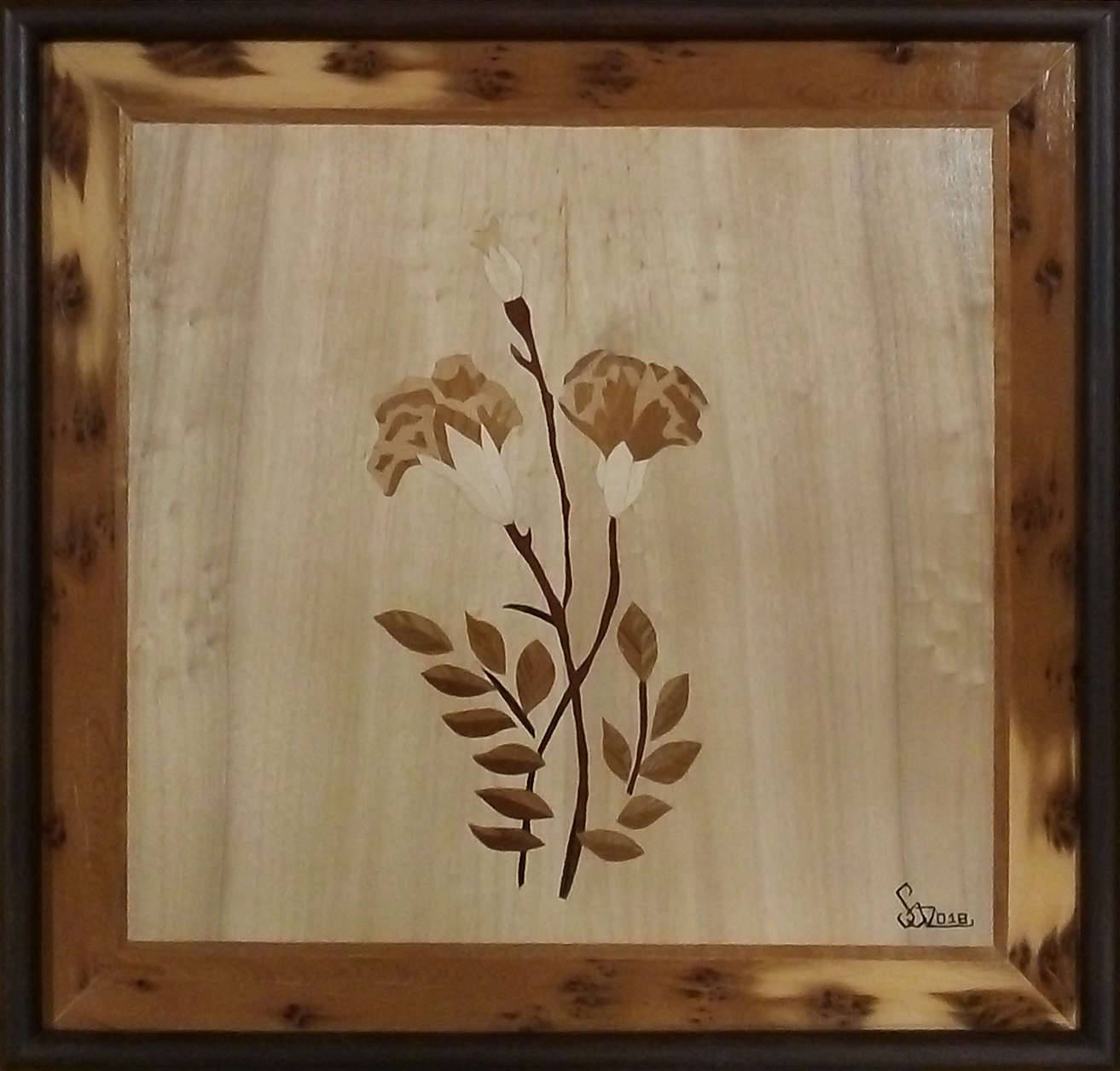 Na deskę została przyklejona intarsja - obraz zestawiony z kawałków drewnianej politury. Motyw kwiatowy oraz ramki wykonano z różnych rodzajów drewna, m. in. czeczotu dającemu ciekawy efekt w tle. Obraz sprzedawany z ramą +1,8 cm.