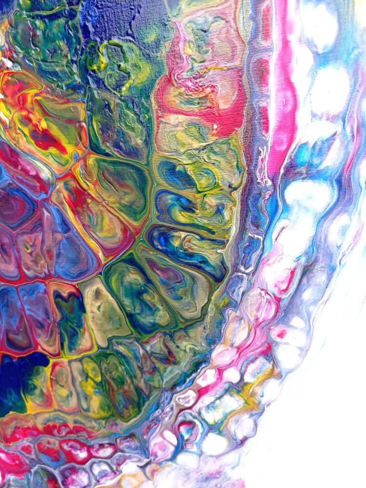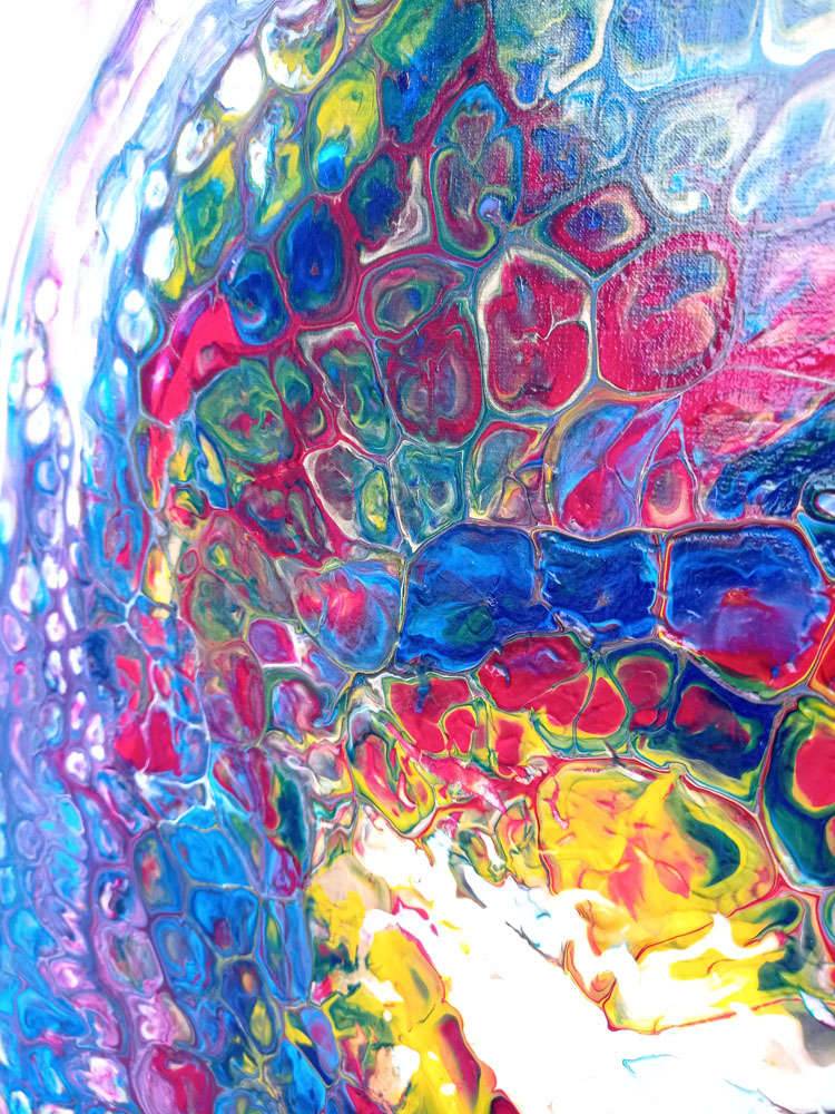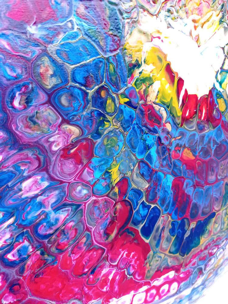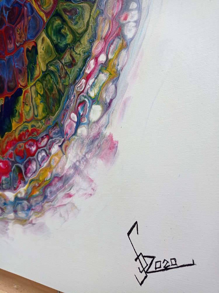 Obraz akrylowy (pouring) wysokiej jakości farbami na gotowym podobraziu malarskim (płótno bawełniane naciągnięte na sosnowy blejtram). Sygnowany, zabezpieczony werniksem. Po zakupie klient otrzyma certyfikat autentyczności z podpisem autora obrazu.