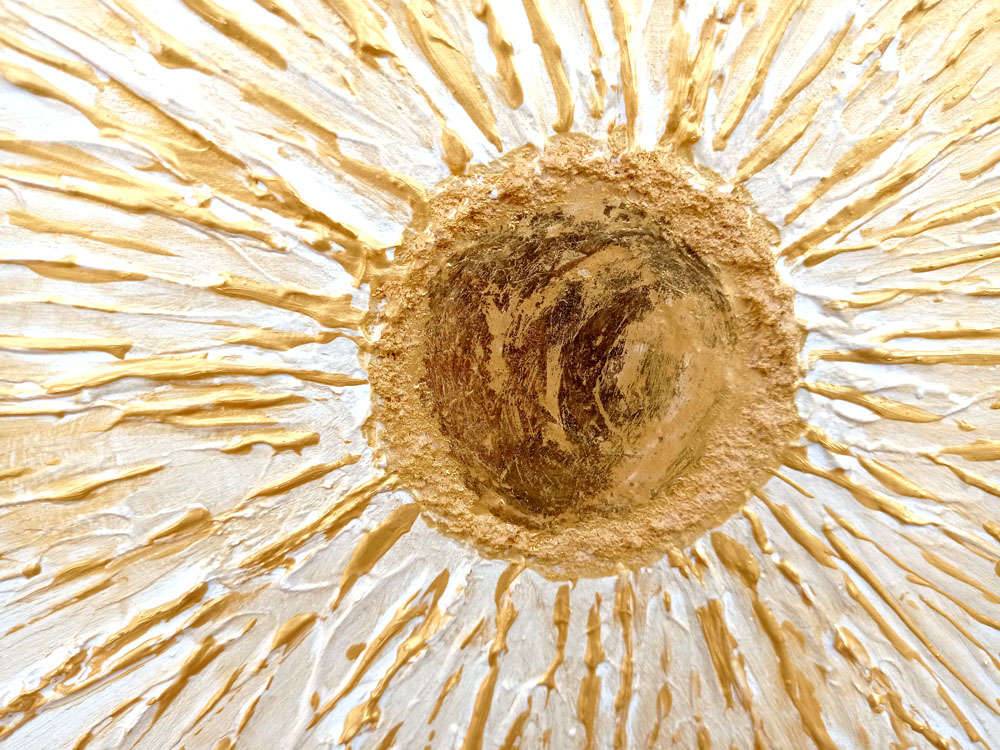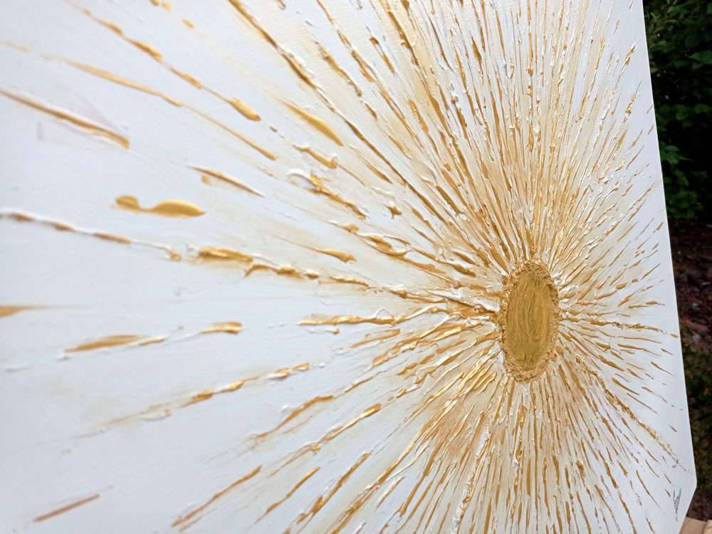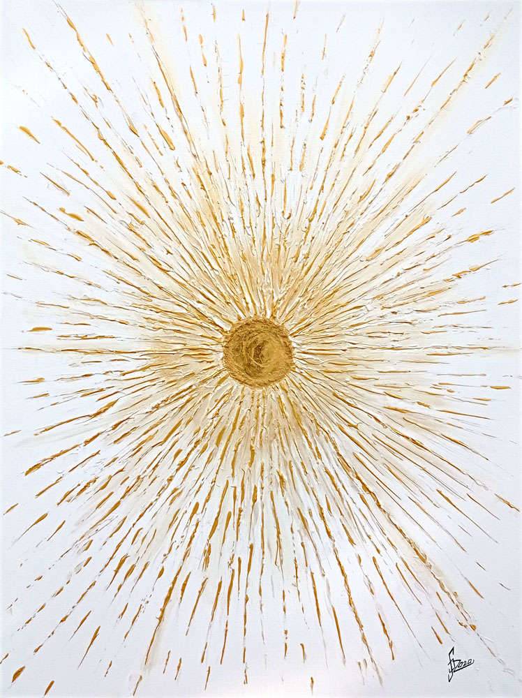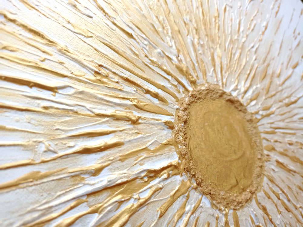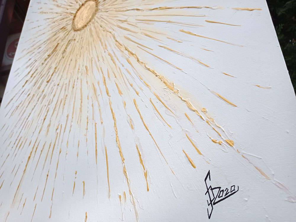 Obraz posiada wypukłe elementy w formie promieni światła co daje efekt trójwymiarowości. Do ozdobienia części środkowej użyto 24 karatowego złota. Obraz ręcznie malowany farbami akrylowymi na gotowym podobraziu malarskim (płótno bawełniane naciągnięte na sosnowy blejtram). Sygnowany, zabezpieczony werniksem. Po zakupie klient otrzyma certyfikat autentyczności z podpisem autora obrazu.