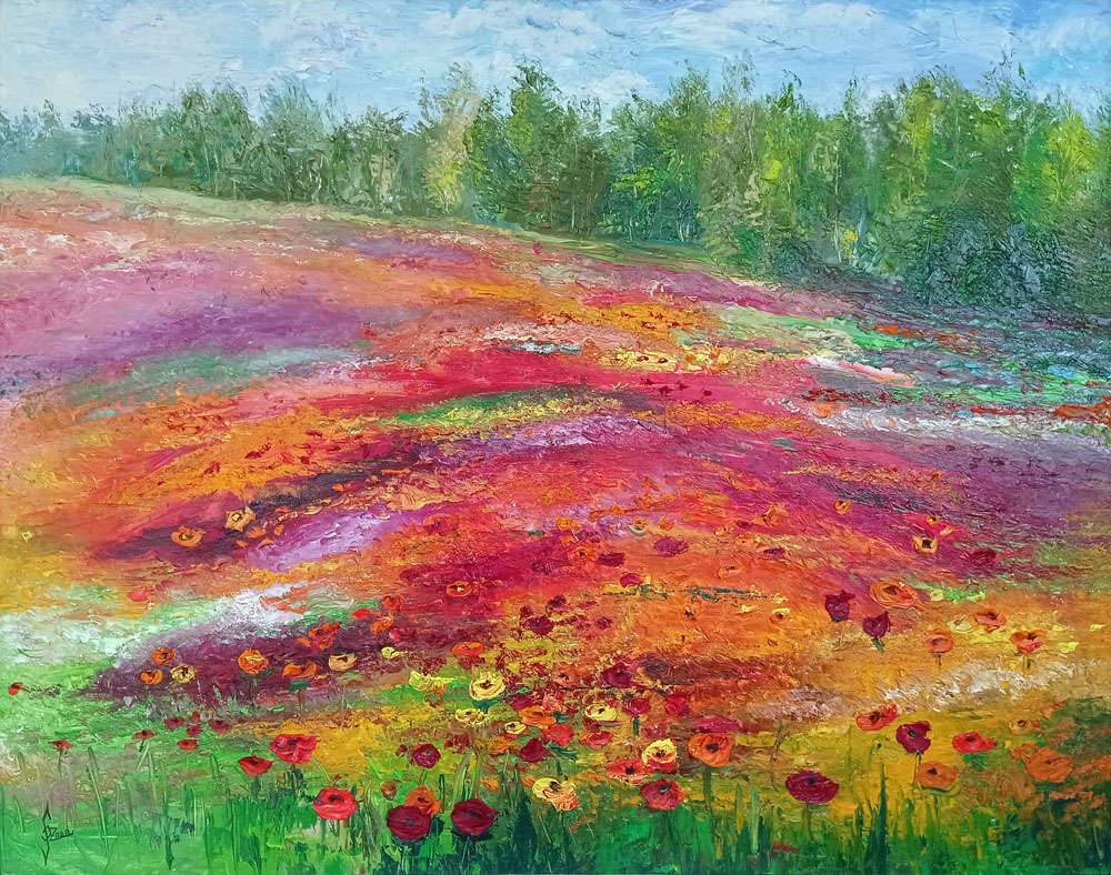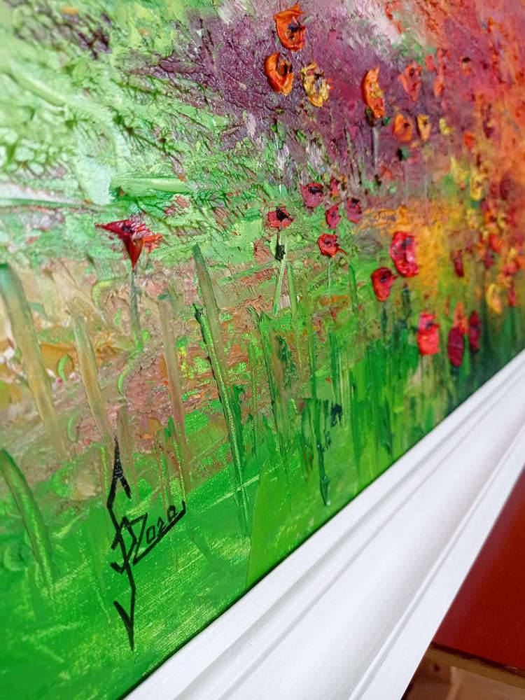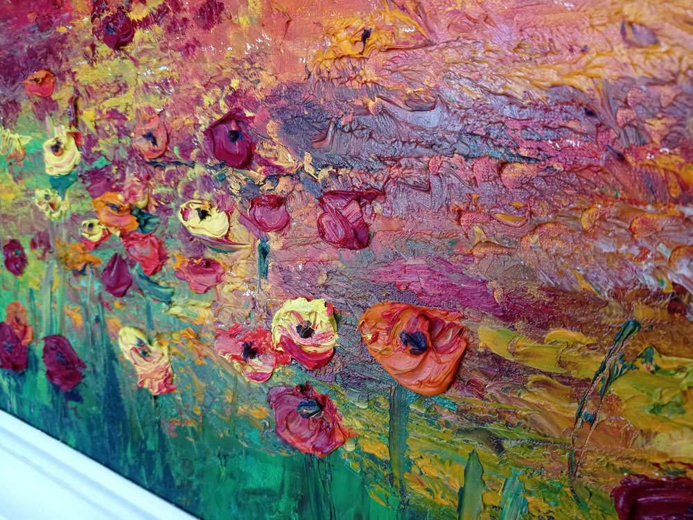 Obraz olejny ręcznie malowany szpachlą wysokiej jakości farbami na gotowym podobraziu malarskim (płótno bawełniane naciągnięte na sosnowy blejtram). Malowany szpachelką, miejscami gruba faktura farby olejnej. Sygnowany, zabezpieczony werniksem. Obraz sprzedawany jest z białą ramą. Całość ma 91x110 cm. Po zakupie klient otrzyma certyfikat autentyczności z podpisem autora obrazu.