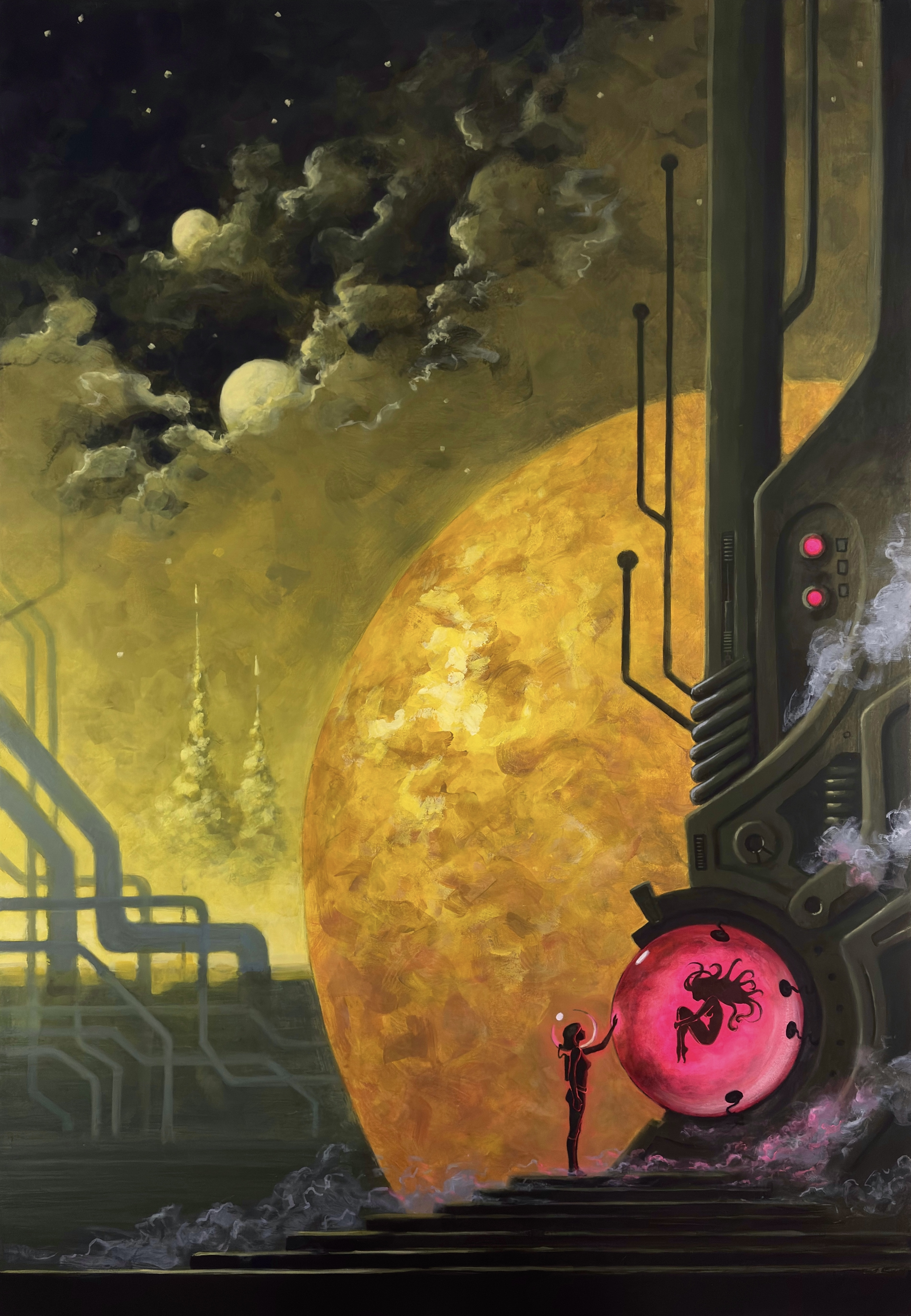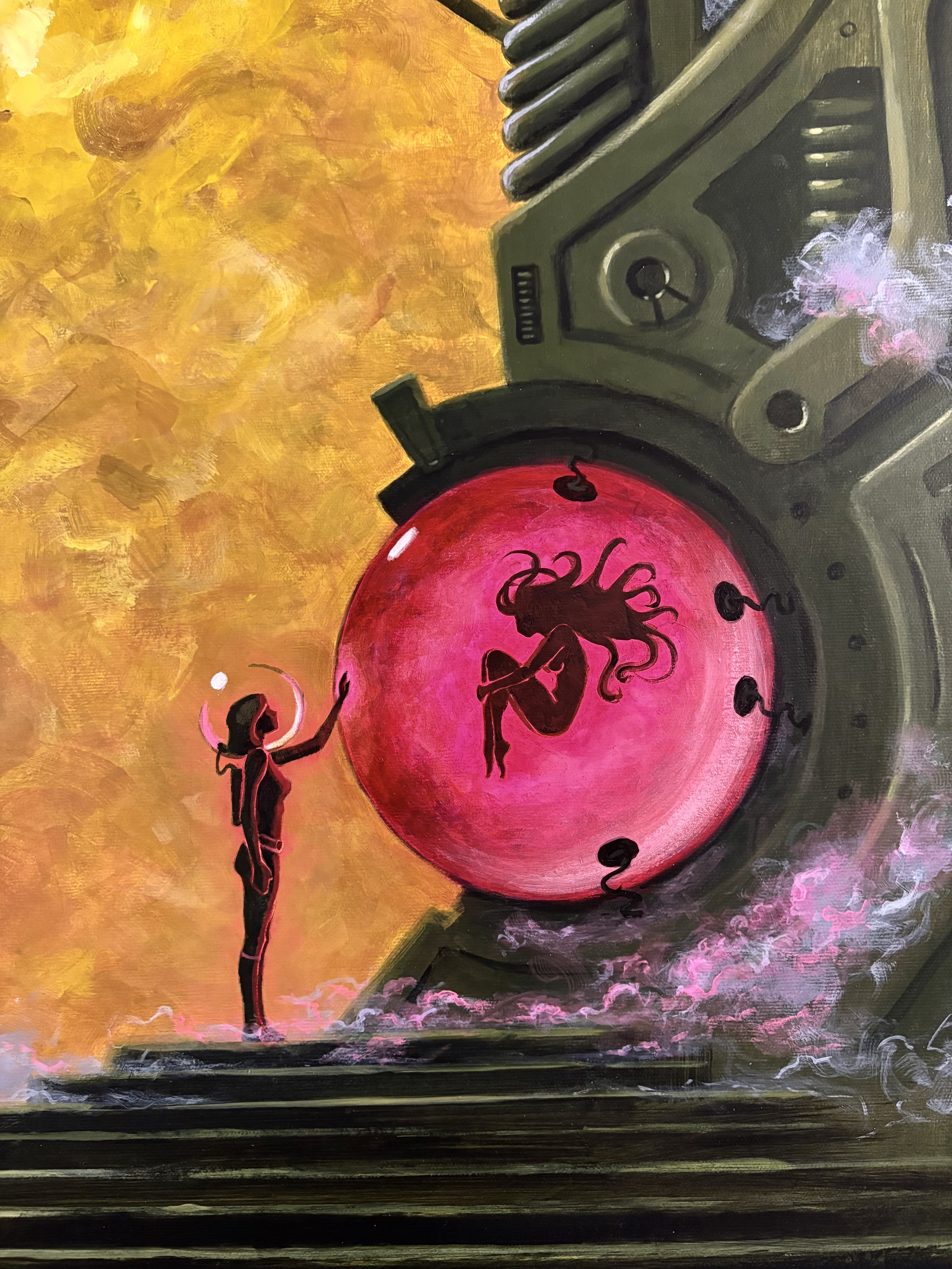 „Strażnik pierwotnej świadomości” to opowieść o punkcie styku między surową naturą istnienia a potęgą tego, co nieuświadomione. Obraz ukazuje moment czuwania nad źródłem – świetlistą sferą, która zdaje się pulsować rytmem wszechświata. Postać Strażnika nie jest tu sędzią, lecz ogniwem łączącym to, co technologiczne i chłodne, z tym, co żywe i pierwotne. To wizja granicy, na której pilnujemy dostępu do własnej prawdy, chroniąc ją przed rozproszeniem w chaosie zewnętrznego świata. To propozycja dla kolekcjonerów, którzy w sztuce szukają głębokiego osadzenia i spokoju wynikającego z wiedzy o własnych korzeniach. Dla odbiorcy, który rozumie, że bycie strażnikiem to nie walka, lecz trwanie w pełnej obecności przy tym, co w nas najcenniejsze. Obraz malowany na płótnie, grube krosno 3,5cm , boki podobrazia zamalowane, Werniksowany błyszczącym werniksem.