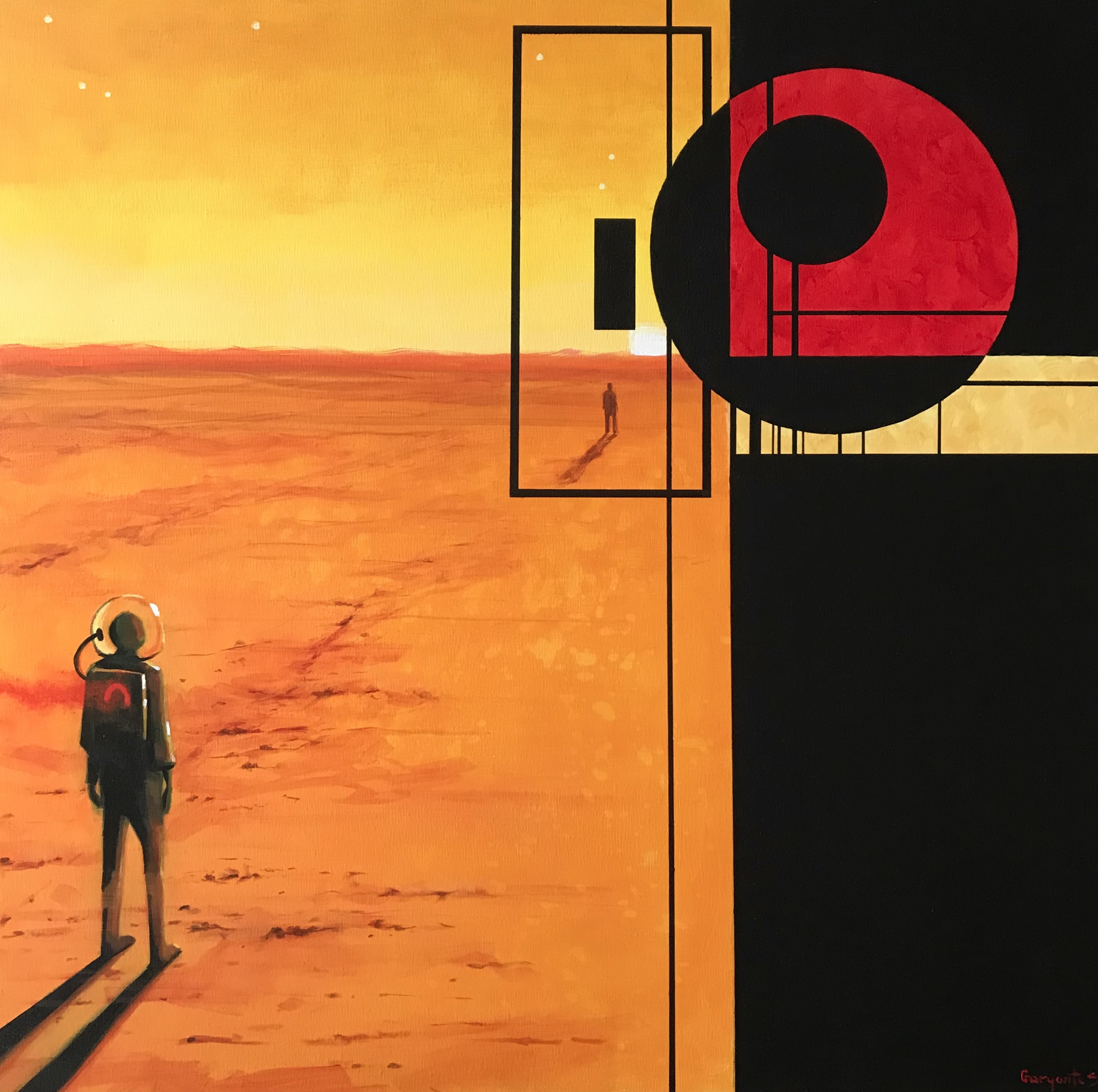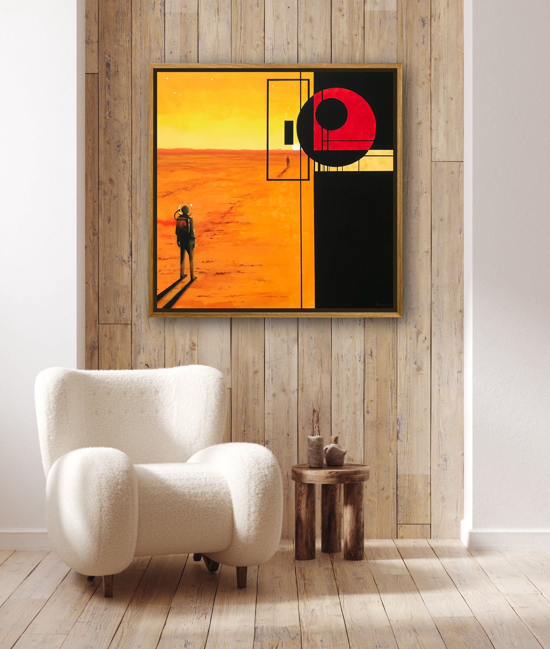 Zanurz się w świat, gdzie granice rzeczywistości rozmywają się, a przestrzeń i czas zyskują nowy wymiar. "Międzywymiarowy przeskok świadomości" to obraz, który przenosi nas na tajemniczą, obcą planetę, gdzie samotny astronauta staje w obliczu nieznanego. Wyraziste odcienie pomarańczu i czerni, geometryczne formy oraz surrealistyczne elementy tworzą kompozycję, która pobudza wyobraźnię i zaprasza do głębszej refleksji. Postać w skafandrze kosmicznym, stojąca w jałowym, pustynnym krajobrazie, symbolizuje podróż nie tylko w przestrzeni, ale i w głąb ludzkiej świadomości. Geometryczne kształty z prawej strony obrazu dodają mistycznego wymiaru, sugerując istnienie innej rzeczywistości, do której możemy przenieść się poprzez akt kontemplacji. Niech "Międzywymiarowy przeskok świadomości" stanie się wyjątkowym elementem Twojej kolekcji, inspirując codziennie do odkrywania nowych perspektyw i poszerzania granic własnej wyobraźni. To nie tylko dzieło sztuki, ale i klucz do tajemnic wszechświata.