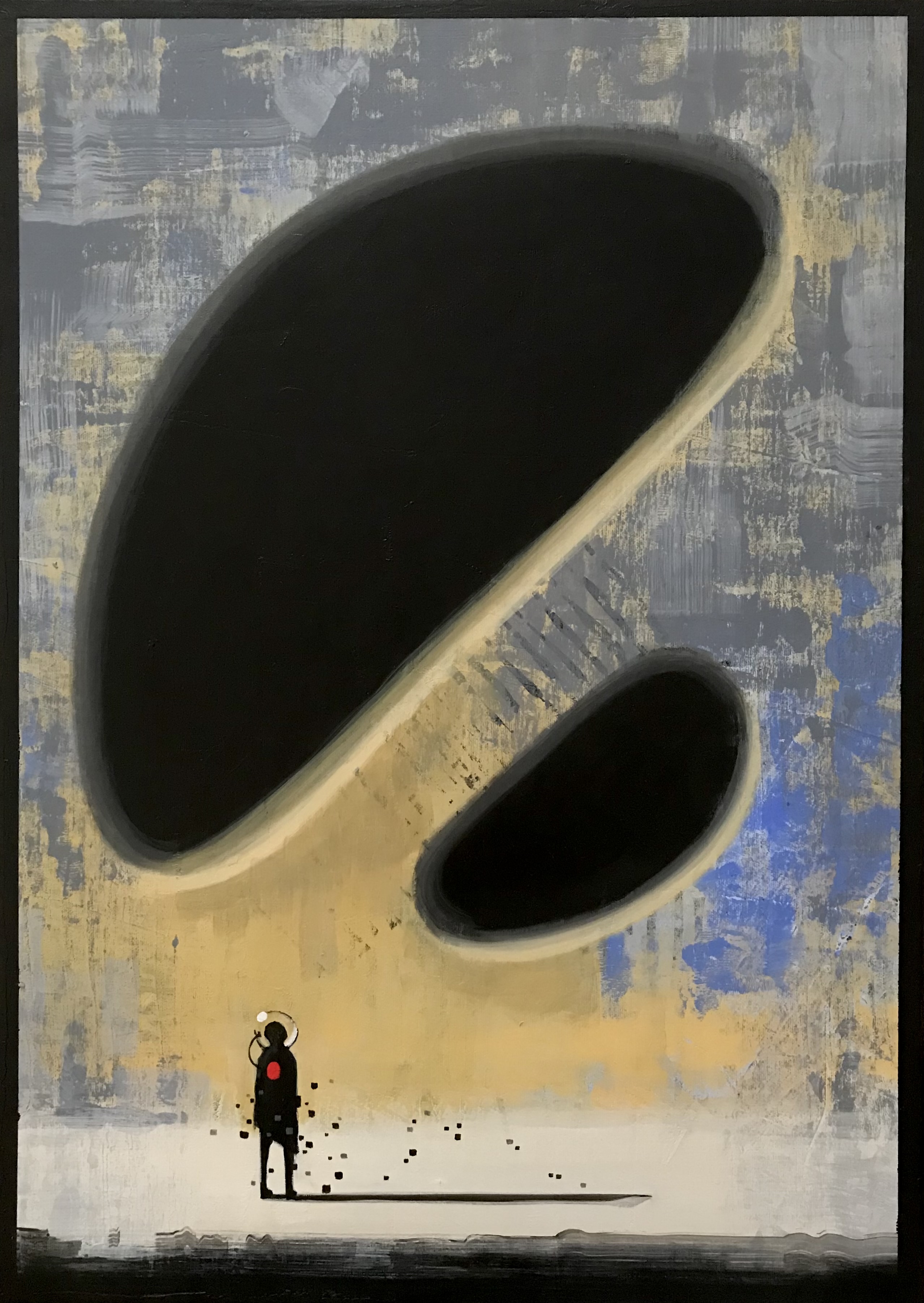 W przestrzeni, gdzie czas płynie jak piasek, rozciąga się harmonia kwantowej rzeczywistości. W tej wizji każda cząsteczka tańczy w bezruchu, jednocześnie istniejąc w równoległych wszechświatach. Cisza rezonuje echem w nieskończoności, a figura człowieka, kontempluje swój los w gęstej pustce. To chwila między myślą a jej urzeczywistnieniem, gdzie percepcja i rzeczywistość stapiają się w jedną, pulsującą falę. Obraz wywołuje pytanie o to, co jest, a co mogłoby być, zapraszając do poszukiwania wewnętrznej harmonii w chaotycznym kosmosie. To obraz, który wzywa do podróży przez cienie i światło — między lękiem a nadzieją, niepewnością a odwagą. Każdy widz odnajdzie tu własne odbicie i swoje kroki ku wewnętrznej przemianie. Czy odważysz się odkryć, co czeka w głębi Ciebie?