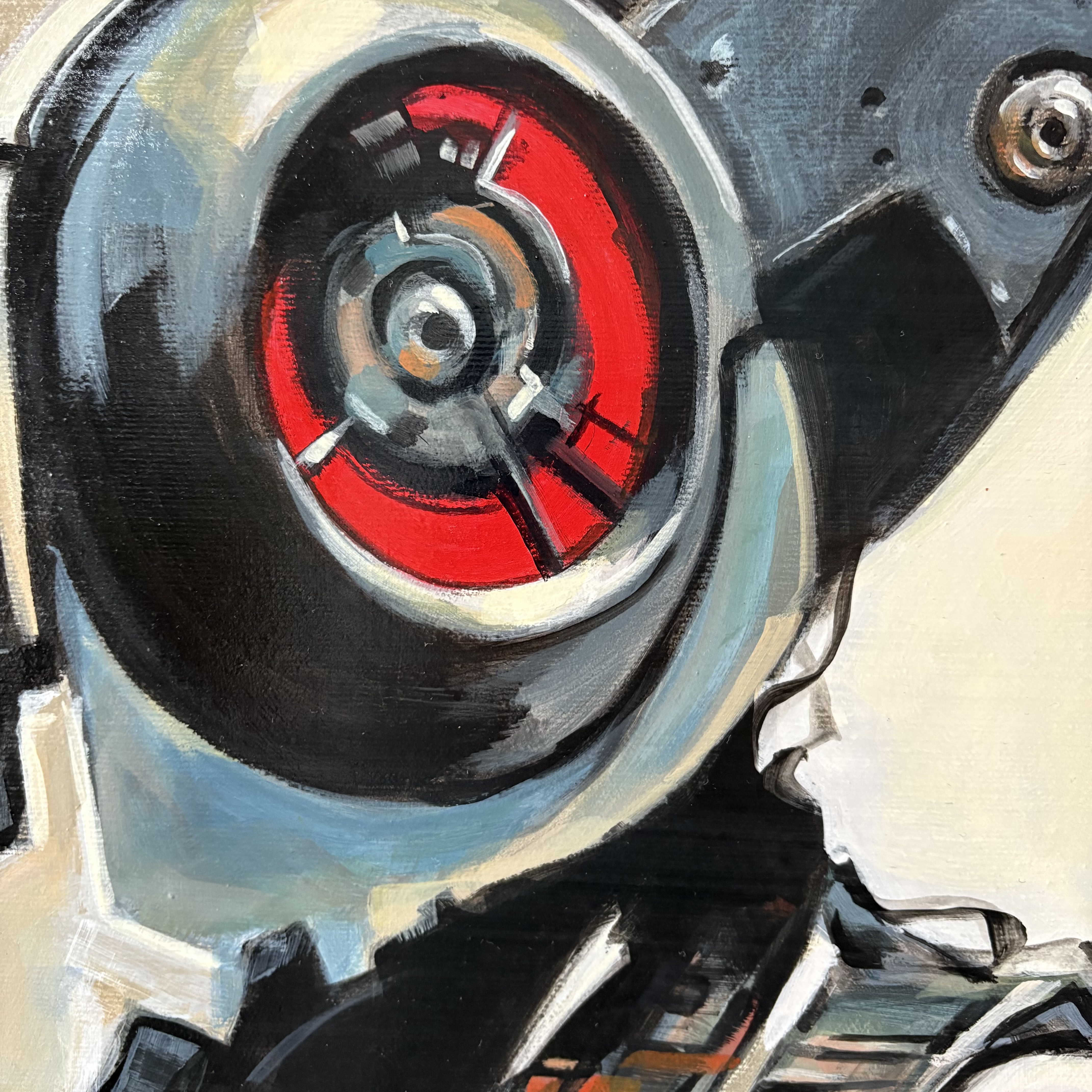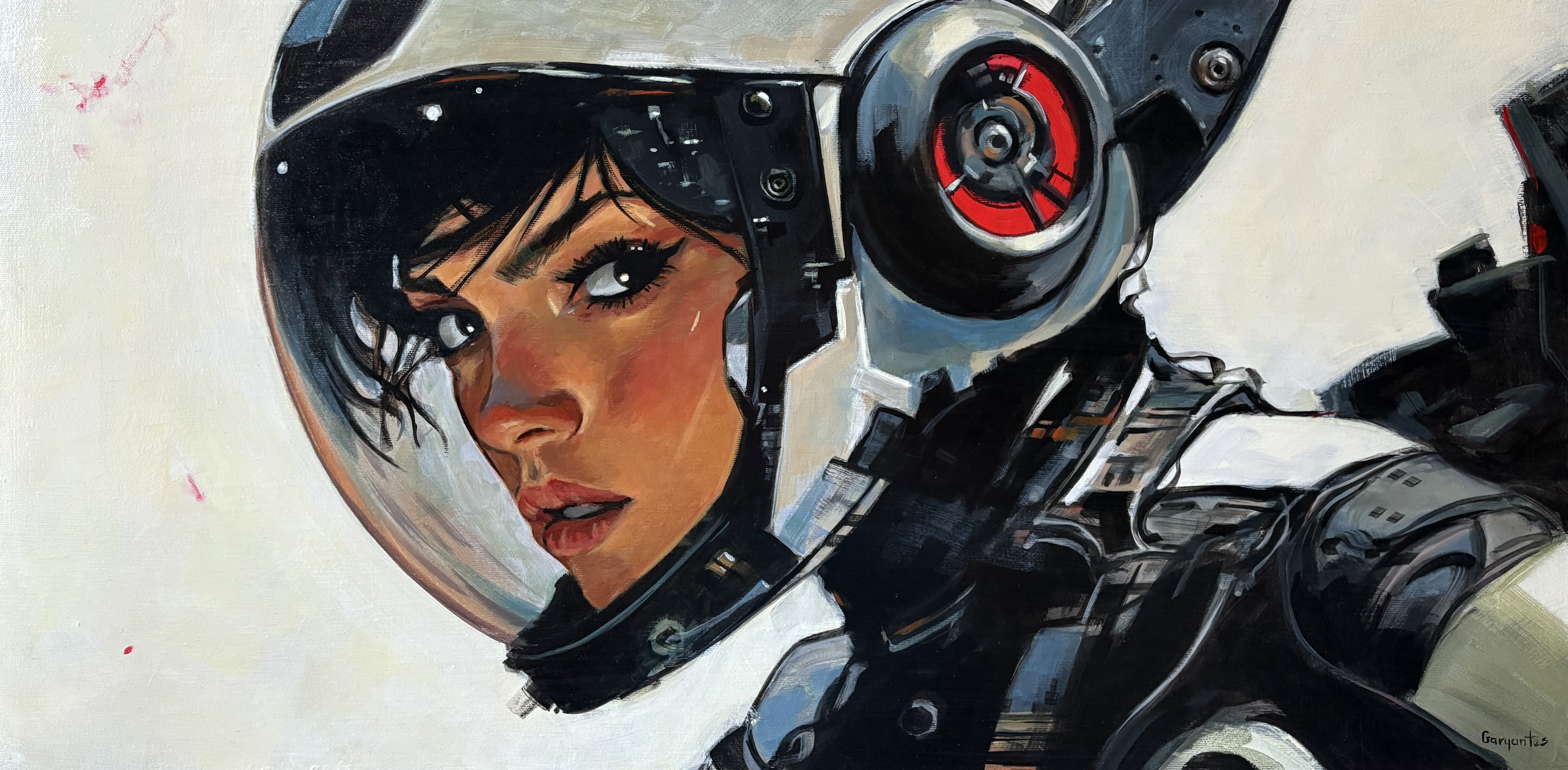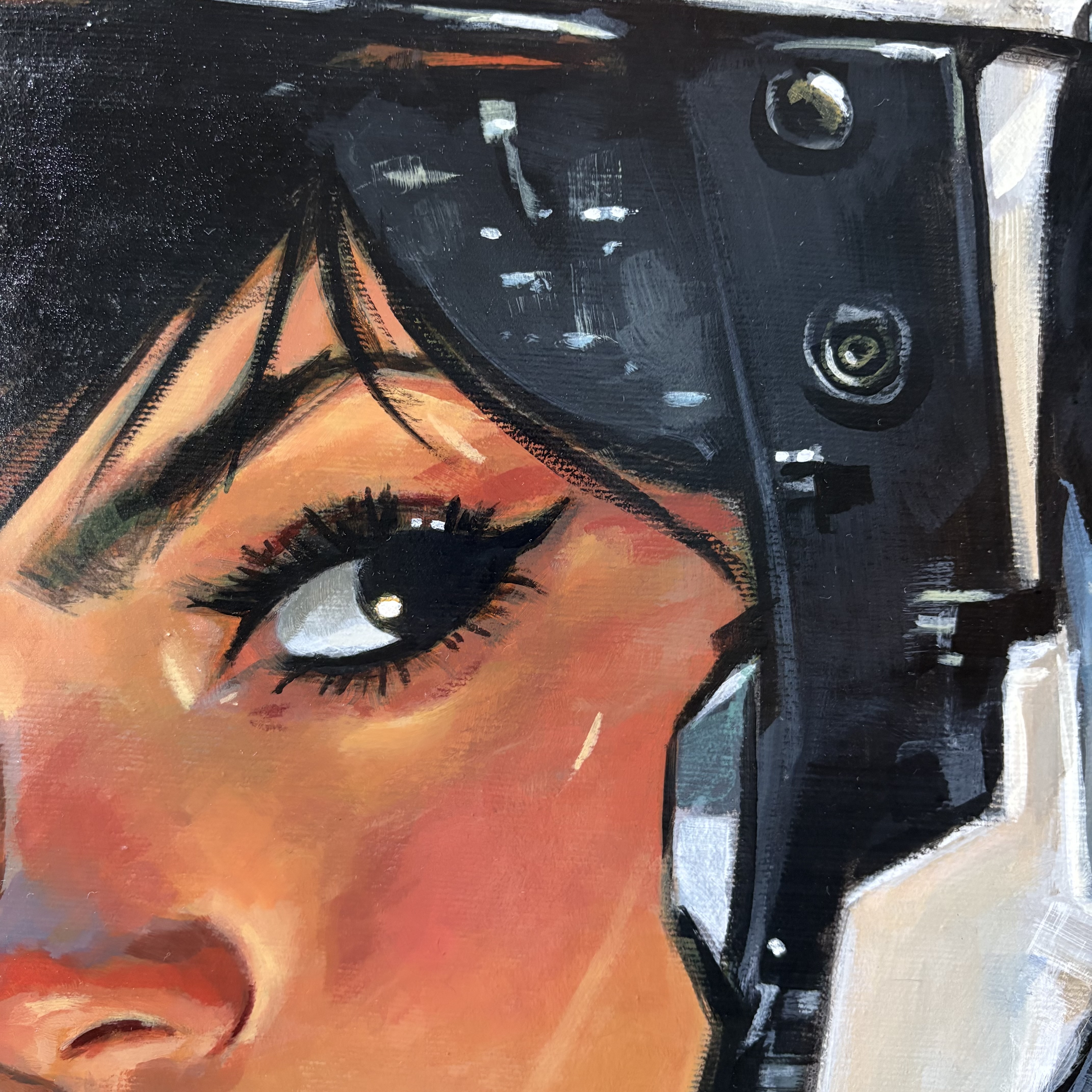 Portret kobiety w futurystycznym hełmie jest pełen intensywności i emocji. To opowieść o odwadze, determinacji i tajemnicy, która kryje się w spojrzeniu bohaterki. Dynamiczna gra światła i cieni podkreśla głębię postaci, a hełm z technicznymi detalami otwiera przestrzeń do interpretacji – czy to astronautka, odkrywczyni nowych światów, czy może bohaterka własnej, wewnętrznej podróży? Malowany akrylem na płótnie, obraz wykończony został błyszczącym werniksem, który dodaje mu energii i podkreśla bogactwo kolorów. Zamalowane na czarno boki sprawiają, że praca nie wymaga ramy – gotowa, by od razu stać się centralnym punktem każdej przestrzeni. To dzieło idealne dla miłośników sztuki nowoczesnej, fanów motywów science fiction lub osób poszukujących czegoś, co inspiruje i prowokuje do refleksji.