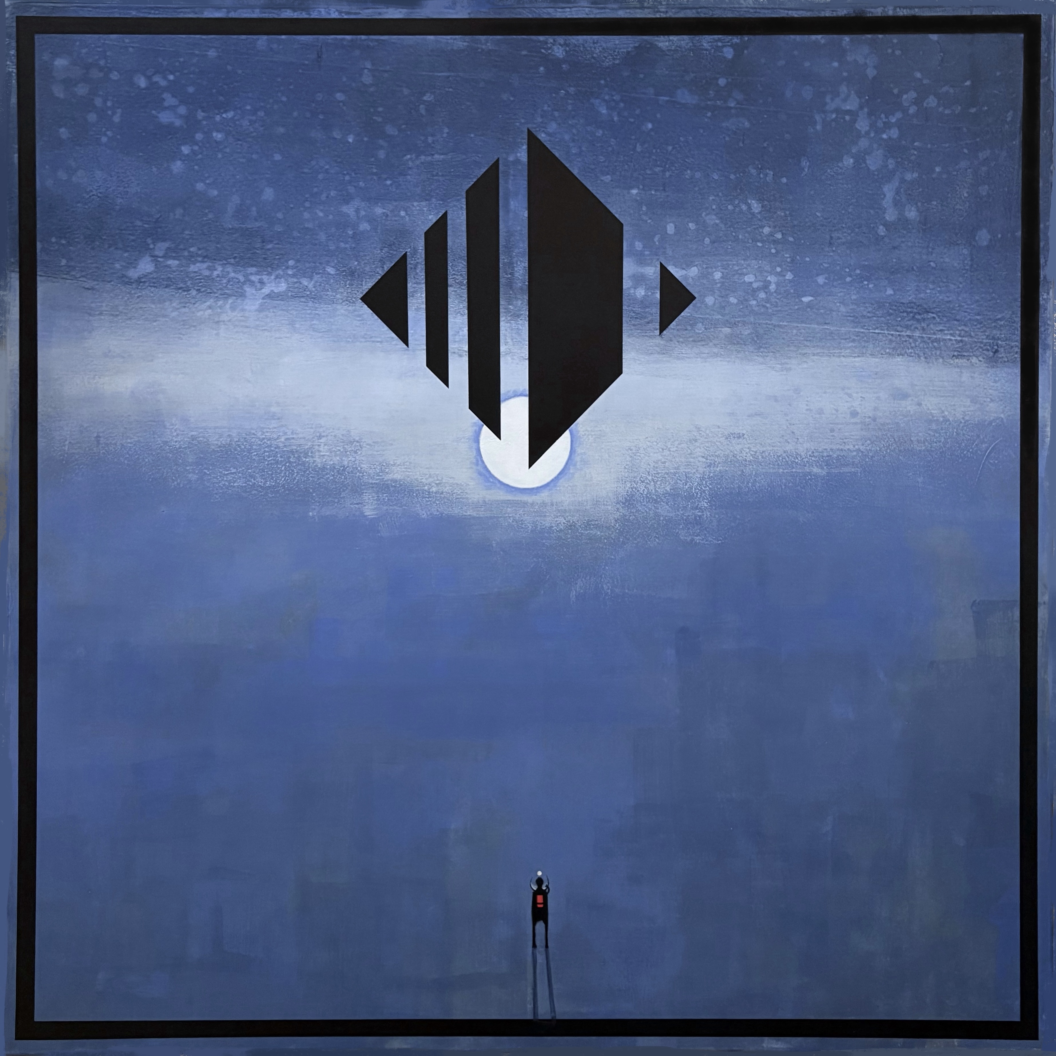 „Pierwszy kolor światła w cieniu zapomnienia” to opowieść o chwili zatrzymanej pomiędzy początkiem a końcem, o miejscu, gdzie światło rodzi się z pamięci, której już nie ma. Zanurzony w chłodnych tonach ultramaryny przełamanej błękitnymi szarościami, obraz ten emanuje ciszą głęboką jak bezkres — przestrzeń, w której pojawia się symbol. Czarny, obecny, lecz niedostępny, zawieszony ponad małą postacią podróżnika — świadka czegoś większego niż zrozumienie. To dzieło kontemplacji. Nie daje odpowiedzi, lecz pozwala poczuć wagę pytania. Zmusza do zatrzymania się w bezruchu wewnętrznym — w tym miejscu, gdzie intuicja mówi więcej niż rozum. Błękit tu nie uspokaja, lecz prowadzi ku głębi, która chłodzi i oczyszcza. Idealny do przestrzeni, które potrzebują nie tylko obrazu, ale ciszy. Doskonale współgra z wnętrzami nowoczesnymi, ascetycznymi lub medytacyjnymi — tam, gdzie mniej znaczy więcej, a obecność rzeczy niematerialnych buduje atmosferę refleksji i skupienia. Obraz, który zostaje w myślach, nawet gdy się od niego odejdzie.