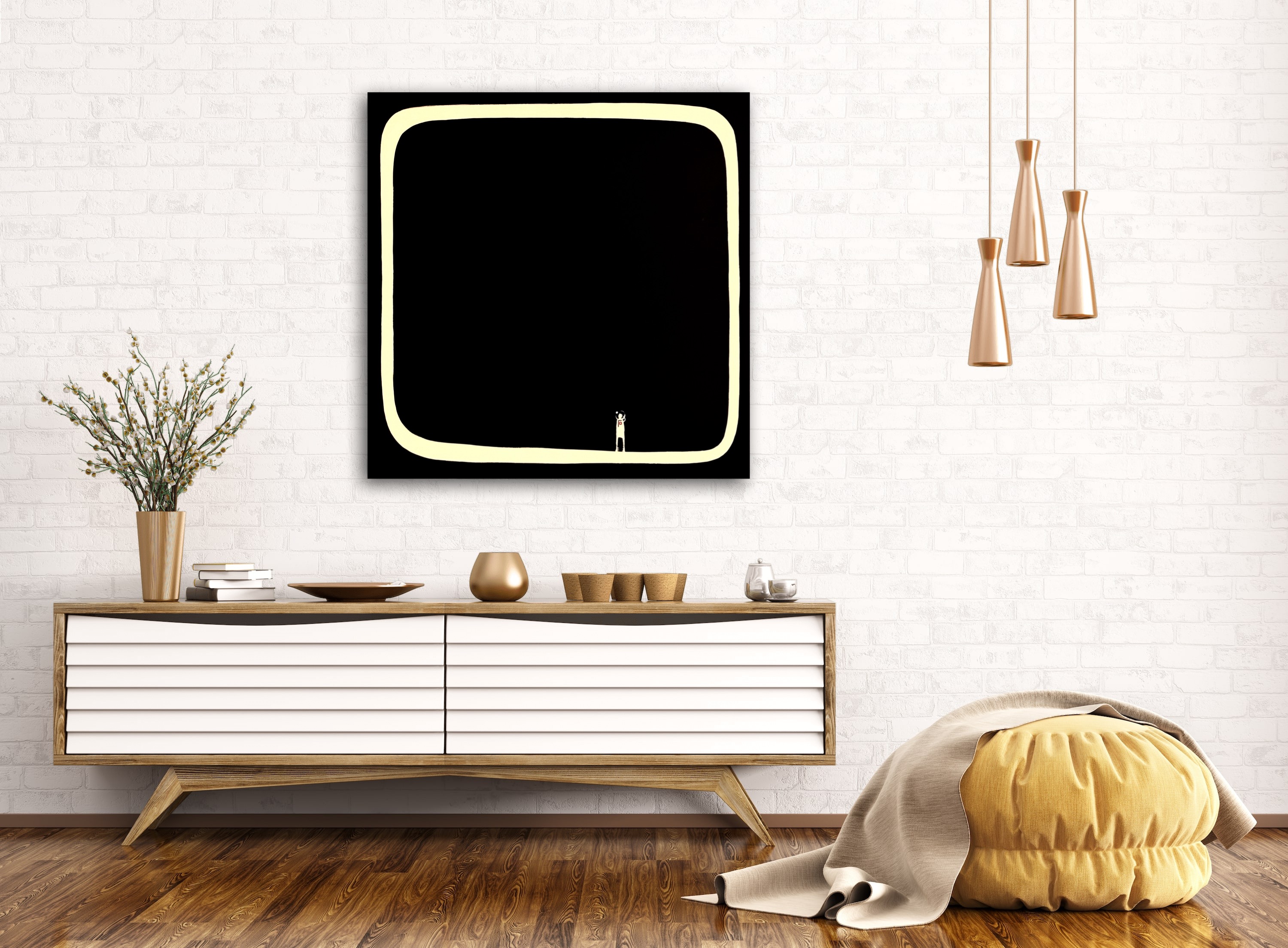 „Ostatnie spojrzenie w serce nicości” to zaproszenie do chwili całkowitej obecności – tej, która pojawia się tuż przed wewnętrzną przemianą. To nie opowieść o końcu, lecz o powrocie. Do źródła. Do siebie. Nicość nie jest tu ciemną pustką – jest pełnią bez formy, przestrzenią, która czeka, byś zajrzał w jej serce i zobaczył tam odbicie własnego istnienia. To miejsce, gdzie zewnętrzny świat cichnie, a wewnętrzna prawda zaczyna szeptać. Obraz emanuje spokojem, który nie uśmierza – ale budzi. Jego surowa forma nie dominuje wnętrza, lecz je dopełnia. Jakby mówił: „To tutaj zaczyna się twoja następna wersja.” Idealny do przestrzeni osobistych, medytacyjnych, nowoczesnych. Gdzie ważne jest nie tylko piękno, ale i znaczenie. Jeśli coś ci w nim gra, jeśli czujesz lekki dreszcz – być może to właśnie twoje ostatnie spojrzenie… zanim ruszysz dalej.