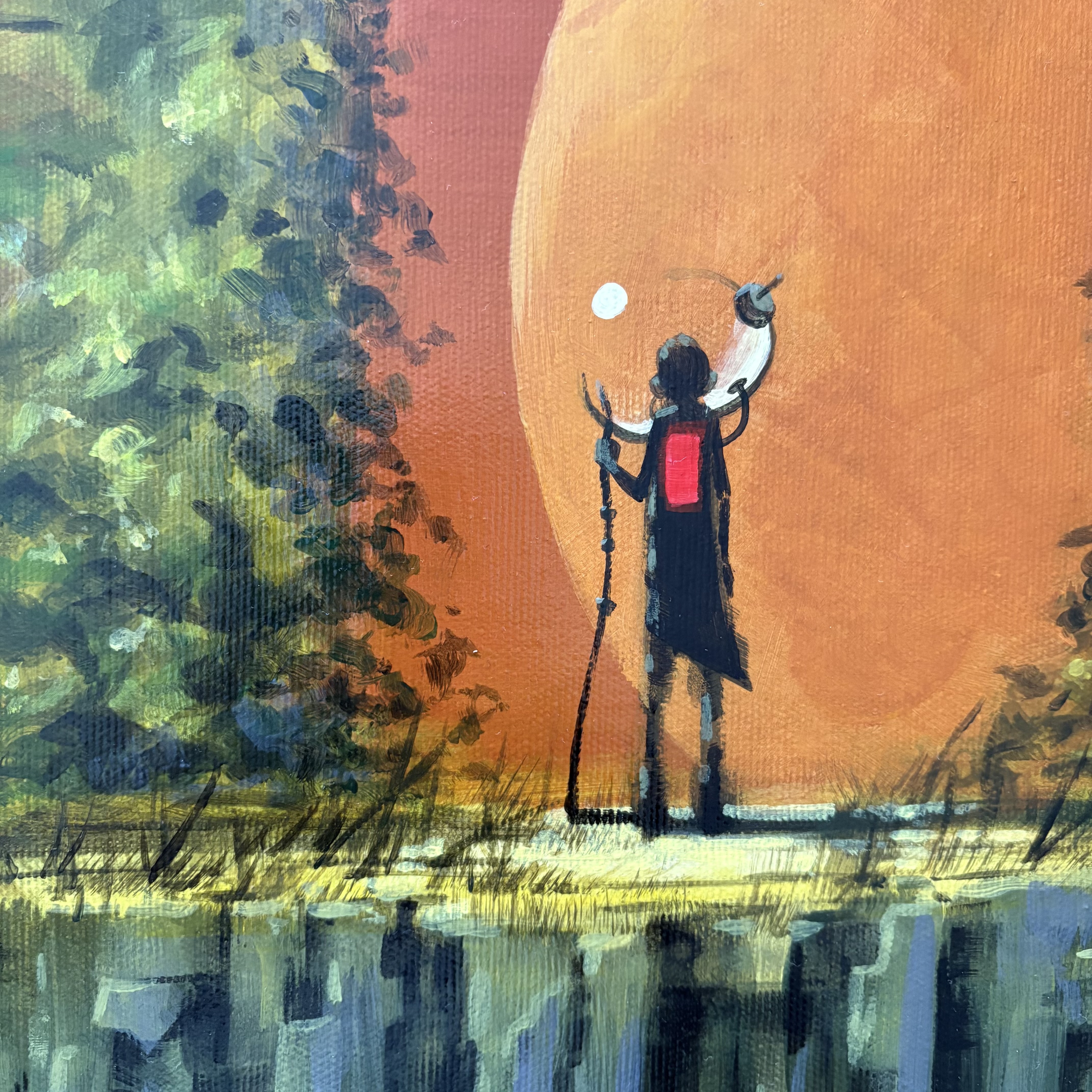 Historia zaćmienia drugiego słońca Czy każde światło niesie prawdę… czy tylko to, które zdołaliśmy ocalić? W przestrzeni pomiędzy pierwszym impulsem a ostatnim wspomnieniem, powoli wygasa drugie słońce – nie z braku mocy, ale z potrzeby ciszy. Jego zaćmienie nie jest końcem, lecz zapisem. Niewidoczną kroniką wewnętrznych decyzji, które nie miały jeszcze słów. To nie historia astronomiczna, lecz opowieść o tym, co dzieje się tuż przed momentem przemiany. Kiedy jeszcze jesteś tym, kim byłeś – ale już zaczynasz słyszeć echo tego, kim możesz się stać. W strukturach tej pracy ukryte są rytmy powolnej transmutacji. Geometryczne pasma i linie jak fragmenty kodu – może świętego, może tylko Twojego. To obraz dla tych, którzy znają smak międzyczasów – i wiedzą, że nie każde słońce wschodzi na nowo. Czasem największym światłem jest to, które gaśnie, zostawiając po sobie niewidzialny szlak. Jeśli coś w Tobie drgnęło, jeśli obraz przemówił zanim zdążyłeś go zrozumieć – być może właśnie dla Ciebie został zakodowany. Obraz zabezpieczony błyszczącym werniksem. Boki podobrazia zamalowane