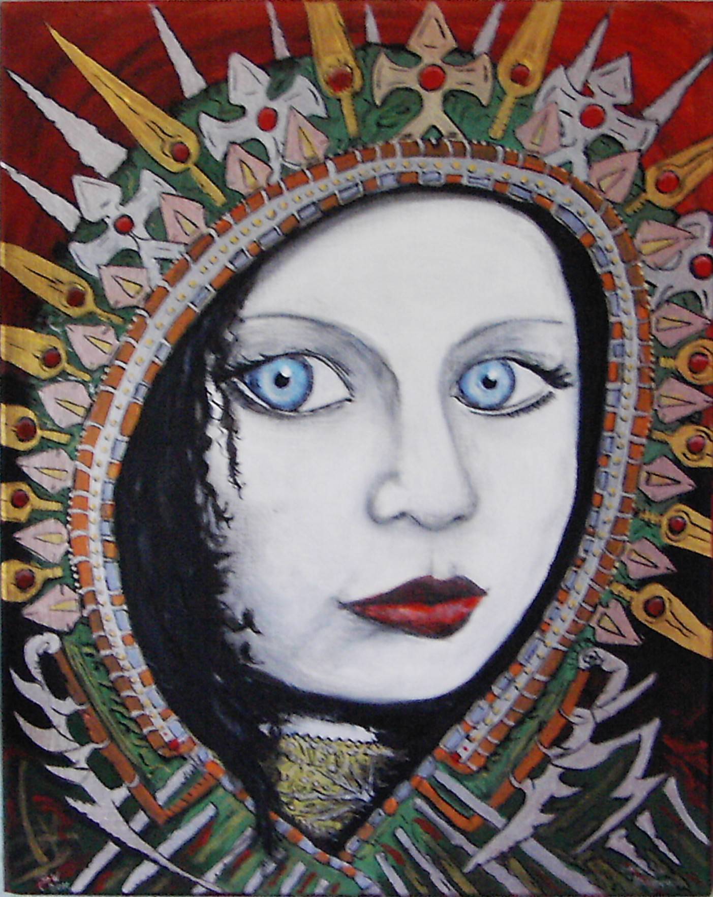 Obraz hipnotyzuje widza swoją intensywnością kolorów i niecodziennym układem. Centralnym elementem jest twarz o przenikliwie niebieskich oczach, które zdają się zaglądać w duszę patrzącego. Biała cera kontrastuje z czerwienią ust, co dodaje kompozycji dramatyzmu. Za tą postacią rozciąga się korona pełna złożonych wzorów - złote, zielone i czerwone elementy układają się w misterne kształty, przypominając ornamentalne wzory z czasów średniowiecznych. Czuć tu atmosferę tajemnicy i mitologii. Może troszeczkę scary, a trochę mystic. Czujesz klimat baśni, jakby zaraz miało się wydarzyć coś niezwykłego. Styl artysty łączy elementy realistyczne z symbolicznymi, dodając obrazowi marzycielskiego charakteru. Techniki mieszania kolorów z konturami przypominają techniki stosowane w sztuce secesyjnej, gdzie każda linia jest jak przemyślana nitka w misternie tkanym gobelinie. Na samym środku tego artystycznego chaosu widz może poczuć iskrę emocji - od melancholii po ciekawość. "To wygląda jak królowa!" tak powiedziałoby dziecko na widok tego dzieła. Obraz wydaje się przemawiać do widza w sposób osobisty, zachęcając do kontemplacji i poszukiwania ukrytych znaczeń. Każdy z nas może zobaczyć coś innego, ale jedno jest pewne: trudno oderwać wzrok od tego magicznego przedstawienia.