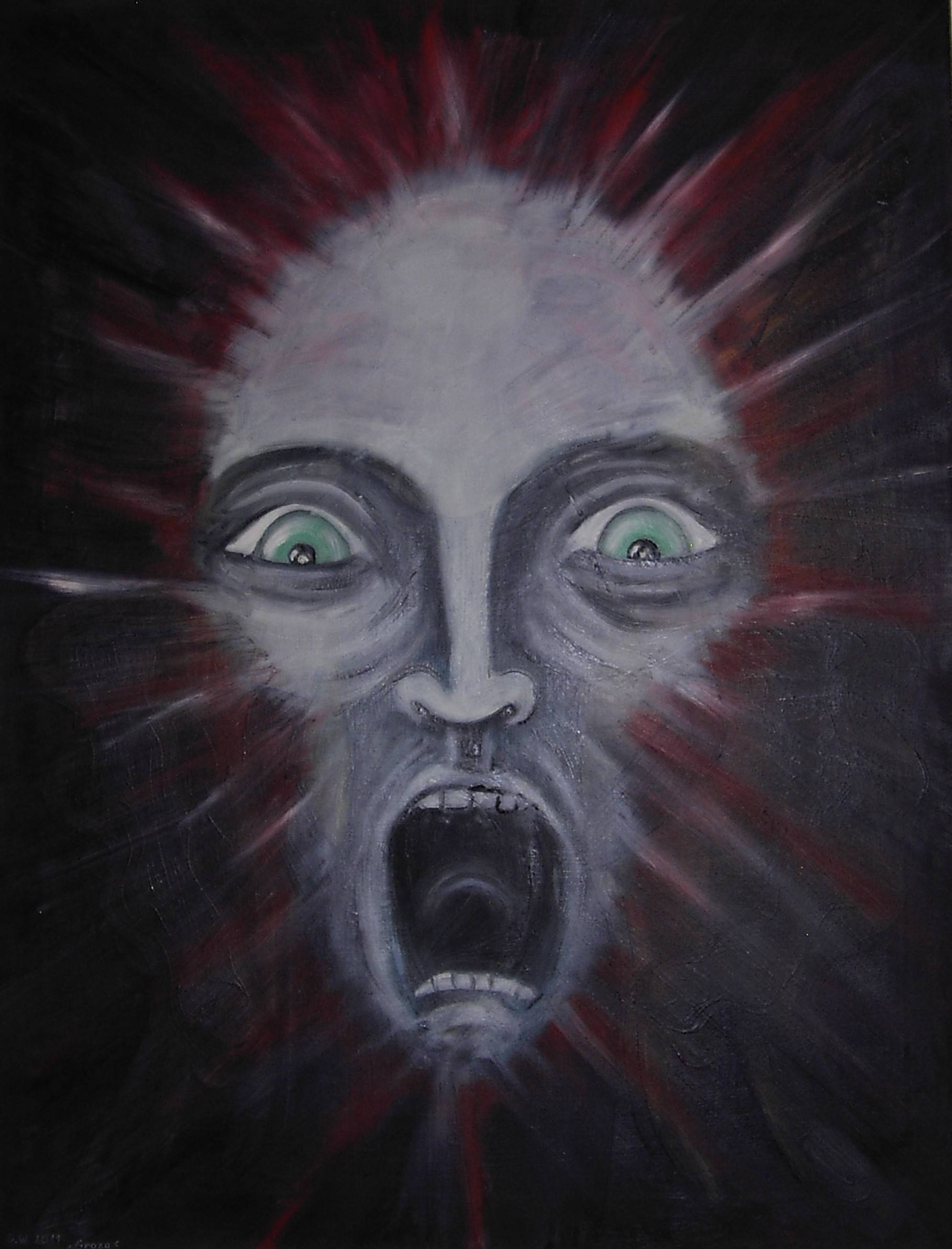 Obraz emanuje potężnym, niemal przytłaczającym wrażeniem krzyku i przerażenia. Centralnym punktem jest ogromna twarz ukazana w głębokiej perspektywie, jej oczy szeroko otwarte, jakby zobaczyły coś, co może zmrozić krew w żyłach. Kolory to mieszanka szarości i czerni, z wyróżniającymi się zielonymi oczami, co dodaje dramatyzmu i intrygi. Elementy rozchodzących się promieni w odcieniach czerwieni podkreślają intensywność emocji, tworząc niemal eksplozję wizualną. Obraz zachowuje klimat mrocznej ekspresji, który przywodzi na myśl techniki stosowane w surrealizmie. Artysta z pewnością chciał złapać ten moment strachu, zamrazać go w czasie. A teraz wyobraź sobie, jak to wygląda na żywo – wow. Naiwność malunku przypomina dziecięcy rysunek: Mamo, zobacz, ten pan się boi. Ciekawie zestawione światło i cień dodają pracy głębi, potęgując poczucie niepokoju. Odbiorca może poczuć się przytłoczony, ale jednocześnie zafascynowany. Odważny styl, swobodne pociągnięcia pędzla i energia płynąca z obrazu sprawiają, że staje on przed nami niczym wyrazisty scream. To jest coś, co wciąga, co każe się zatrzymać i pomyśleć. Obraz może budzić refleksję nad ludzkimi lękami, nieświadomą potęgą emocji. Fascynujący.