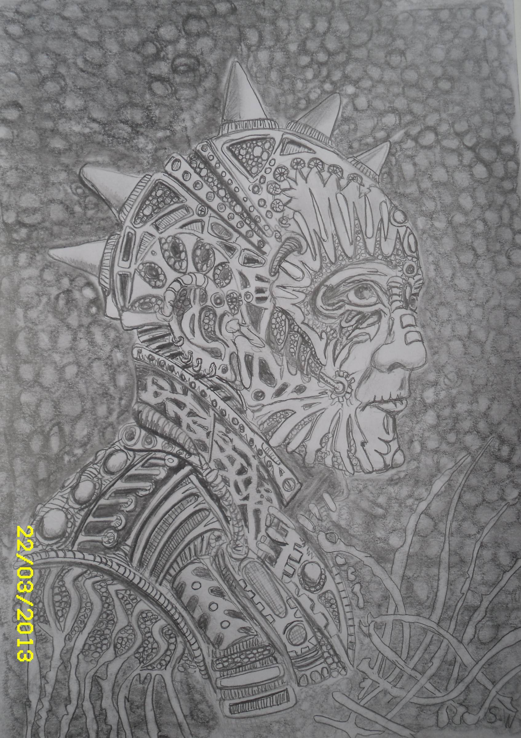 Na obrazie widzimy niezwykłą kompozycję, w której dominuje postać przypominająca futurystycznego wojownika. Rysunek wykonany jest za pomocą ołówka, co nadaje mu surowości i monochromatycznej estetyki. Artysta skupił się na detalach — pełno tu precyzyjnych wzorów, geometrycznych kształtów i ornamentów, które pokrywają skórę postaci niczym zbroja. Tło jest cieniowane w sposób, który przypomina mgiełkę czy też unoszący się pył. Atmosfera dzieła jest tajemnicza, może nawet nieco niepokojąca. Skąd ten kosmita się wziął? Artystyczny styl przypomina nieco surrealizm, choć z nutką cyberpunku. Użycie drobnych linii i kształtów sprawia, że dzieło wywołuje emocje skupienia i zaciekawienia. Odbiorca może poczuć się przytłoczony bogactwem detali, ale jednocześnie wciągnięty w głąb tej intrygującej opowieści. To jest obraz, który rzuca wyzwanie. I wonder, co ma w głowie ta postać? Wywołuje również skojarzenia z historiami science-fiction, tworząc przestrzeń do indywidualnych interpretacji. Emocje krążą gdzieś między fascynacją a tajemniczością. dziecku by się podobało, na pewno. To dzieło jest jak podróż w nieznane, zachęcające do odkrywania nowych światów ukrytych w szczegółach.