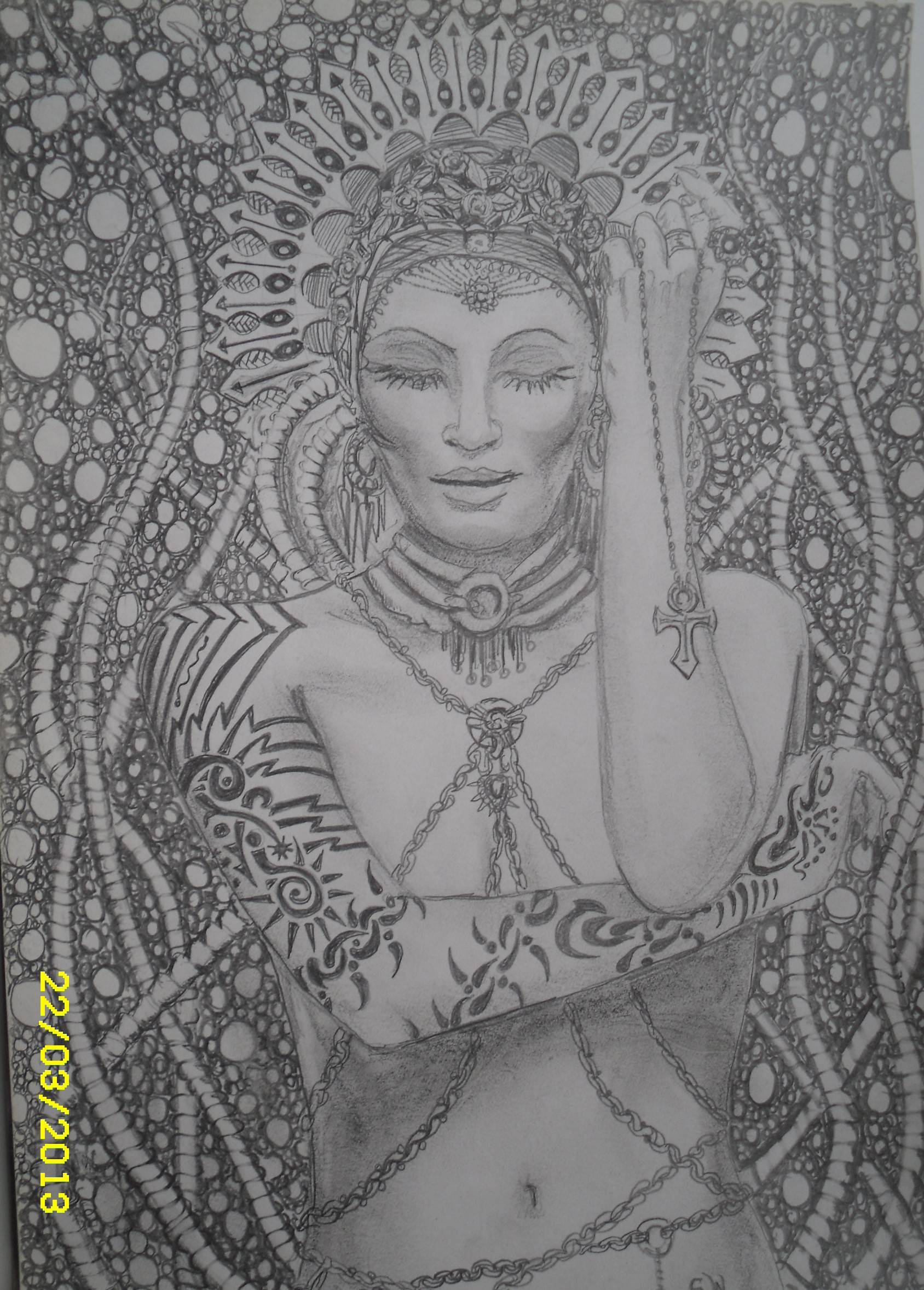 Obraz ukazuje delikatną, eteryczną postać o zamkniętych oczach, zdającą się być zanurzoną w głębokiej medytacji. Dominują odcienie szarości, złożone z misternych linii i wzorów, które przypominają koronkę. Twarz tej postaci emanuje spokojem, a zamknięte oczy dodają jej tajemniczości. Wzory wokół głowy tworzą coś w rodzaju aureoli, nadając całości niemal mistyczny wydźwięk. Te wszystkie wzory, te wszystkie kropki i linie w tle, mogą przywodzić na myśl kosmos, jakby postać była częścią większej całości. To jak sen, który rozlewa się na kartce. Styl jest szczegółowy, niemal jak z surrealistycznych snów. Emocje? Ten obraz mówi: spokój, ale z odrobiną niepokoju, jakbyśmy byli świadkami jakiegoś pradawnego rytuału. Czułem się jak dziecko, które patrzy na jedną z tych magicznych książek. Look, zawołałoby dziecko, widząc to cudo na ścianie. Całość wywołuje uczucie tajemniczej więzi z naturą i wszechświatem.