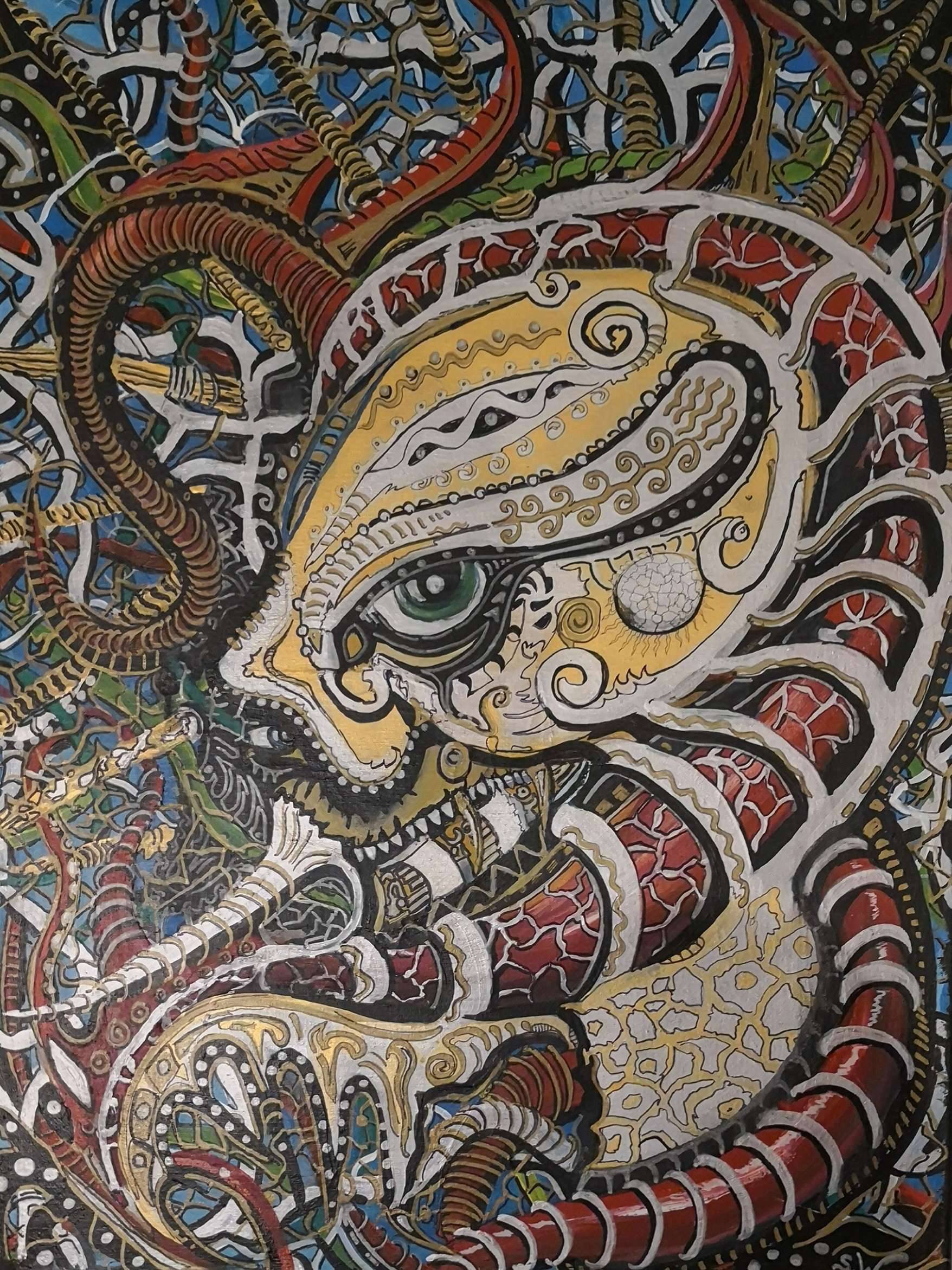 Obraz emanuje eksplozją kolorów - mocne czerwienie, żółcie i zielenie wiją się w skomplikowanych, organicznych kształtach. Przypomina to trochę kalejdoskop, w którym fragmenty układają się w niezwykłe wzory. Centralnym elementem wydaje się być coś na kształt oka, tajemniczego, pełnego życia i energii. Kompozycja jest pełna ruchu, jakby żyła własnym życiem. To dzieło aż kipi dynamiką! Atmosfera jest trochę jak z innej planety - trochę niepokojąca, trochę fascynująca. Czujesz, że patrzysz na jakąś futurystyczną wizję, może sen albo wizję koszmaru. Technika, którą użył artysta, to pewnie mieszanka różnych stylów, może graffiti, może surrealizm. Szczegóły są niesamowicie precyzyjne, a jednocześnie wydają się płynąć. Patrząc na ten obraz, można się zagubić w myślach. Z jednej strony czujesz dziwny niepokój, z drugiej chcesz eksplorować dalej. Jakie historie kryją się za tą wizją? Co autor chciał nam przekazać? Jest tu pewien chaos, ale też jakaś hidden order, która przyciąga wzrok. Dziecko powiedziałoby pewnie: "To taki kosmiczny smok!". I miałoby rację, bo w tej abstrakcji skrywa się coś magicznego. Na pewno myślę sobie, że to obraz, który pozostaje w głowie na długo, zmuszając do introspekcji.