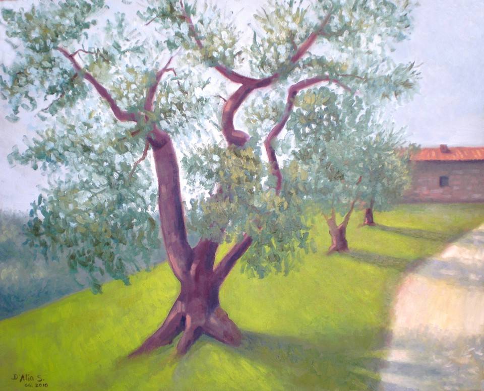 Obraz ukazuje malowniczy krajobraz z rozłożystymi drzewami oliwnymi na pierwszym planie, które rzucają długie cienie na soczyście zieloną trawę. Kora drzew jest czerwonawo-brązowa, emanując ciepłem, które kontrastuje z miękkim, chłodnym błękitem nieba. Na horyzoncie, nieco rozmazany, widnieje budynek z czerwonym dachem, dodając kompozycji równowagi i spokoju. Czyż to nie idealne miejsce na piknik? Obraz ma klimat sielankowej spokojności, przypominając letnie popołudnia, kiedy czas płynie wolniej. Artysta, posługując się swobodnymi, nieco impresjonistycznymi pociągnięciami pędzla, oddaje lekkość i dynamikę sceny. Przejrzystość powietrza i gra światła przywołują uczucie radości i prostoty życia. Nawet dziecko powiedziałoby: "Chciałbym tam pobiegać!" Jest w tym obrazie pewien "charm" nieuchwytny, trudno się nie uśmiechnąć patrząc na tę idylliczną scenerię. Moje osobiste skojarzenie? Właściwie to chciałbym się tam teraz znaleźć, złapać kocyk i czytać pod drzewem.