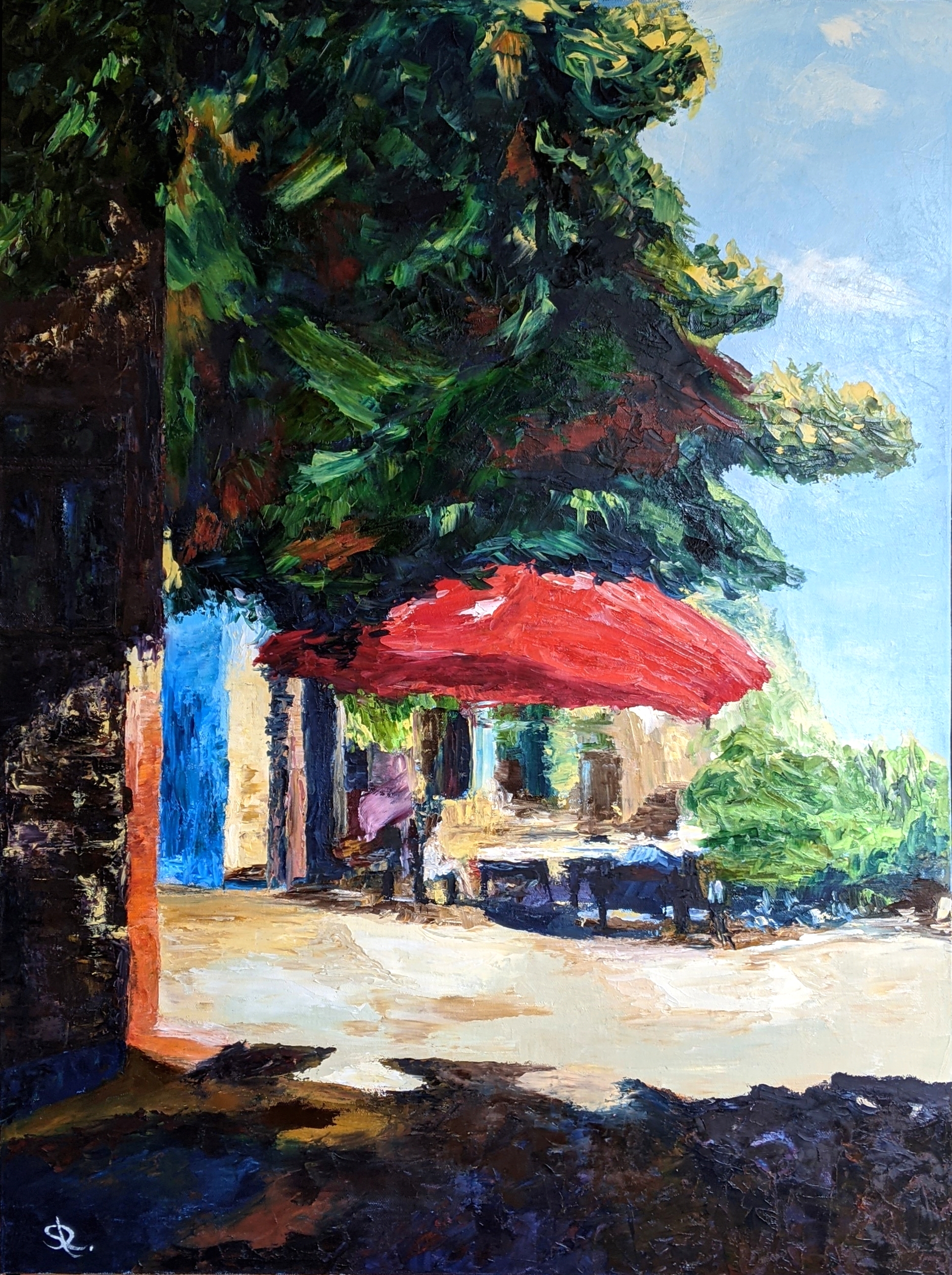 Na tym obrazie dominują intensywne, kontrastujące barwy. Z lewej strony królują ciepłe odcienie brązu i zieleni, które przenikają się w misternie położonych pociągnięciach farby. W centrum uwagi znajduje się jaskrawoczerwony parasol, który niemal krzyczy, przyciągając wzrok i dodając kompozycji dynamiki. Za nim widnieje niebieskie tło, chłodne i spokojne jak letnie niebo. Drzewa po prawej stronie wprowadzają balans i nadają głębi. Atmosfera jest sielankowa, wakacyjna. Pachnie latem i lemoniadą w cieniu. Styl malowania jest swobodny, pełen ekspresji. Artysta używa grubo nakładanej farby, co daje ciekawe fakturowanie. Technika impasto dodaje żywotności i trójwymiarowości. A może ten parasol skrywa jakieś tajemnice? Kto wie.