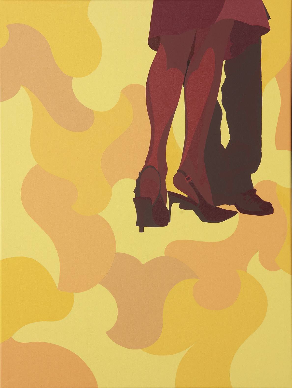 Obraz, który mamy przed sobą, emanuje ciepłymi kolorami. Dominują tutaj odcienie żółci i brązu. Widzimy fragmenty dwóch postaci zanurzone w tańcu. Ich nogi, zarysowane wyraźnymi konturami, przyciągają wzrok. Tło, pełne faliście mieniących się kształtów, dodaje dynamiki tej statycznej kompozycji. Atmosfera jest ciepła, niemalże intymna, jakby zatrzymano chwilę w ruchu, pełną emocji i oczekiwania. Jak w filmie pełnym suspense! Styl artystyczny przypomina pop-art. Mocne kontury i kontrastujące kolory sprawiają, że obraz wygląda niemalże jak plakat. Artysta użył płaskiej perspektywy. Zabawa formą i kolorem dodaje obrazie nowoczesności i świeżości. Taka technika wywołuje w odbiorcy uczucie lekkości, jakby wszystko było jasne i proste. Patrząc na ten obraz, wyobrażam sobie młode pary tańczące na ulicach miasta. To wywołuje uczucie nostalgii, chociaż nigdy tam nie byłem! Ta energia i radość płynąca z tańca, przypomina mi wakacje. Zastanawiam się, co czują te postacie. Czy to miłość? Może beztroska, a może po prostu moment pełen “joy”? Gdy patrzę na to dzieło, przypomina mi się, jak rysowałem jako dziecko, po swojemu, bez względu na poprawność, bo przecież to wszystko jest takie proste i piękne!