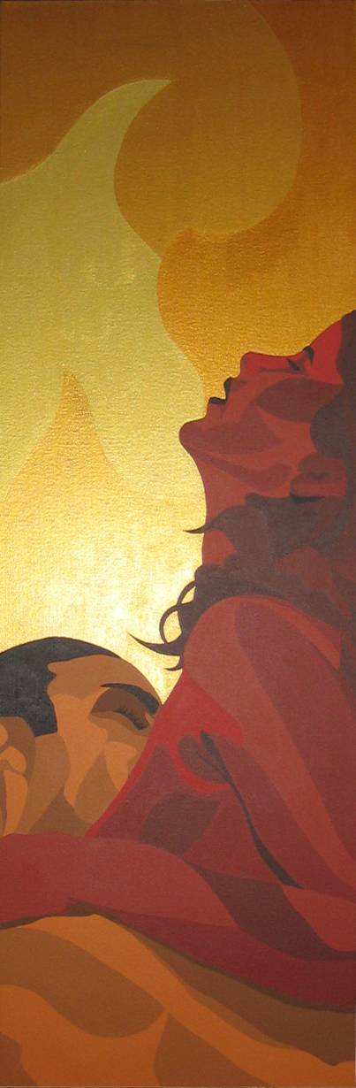 Ten obraz jest pełen energii i namiętności. Dominują na nim ciepłe odcienie brązu i czerwieni, które tworzą harmonijną kompozycję. Postacie są przedstawione z profilu, zanurzone w złocistym tle. Kształty są płynne i dynamiczne, wirują w tajemniczym tańcu. Obraz wygląda, jakby malował go ktoś z zawadiackim uśmiechem, używając śmiałych pociągnięć pędzla i techniki przypominającej plamy kolorów. Atmosfera jest zmysłowa, a może nawet trochę tajemnicza. Sprawia, że czujemy bijące emocje i unoszące się w powietrzu ciepło. Patrząc na ten obraz, można poczuć coś magicznego. Wzbudza emocje jak "wow!", jednocześnie zachęcając do głębszej refleksji nad intymnością przedstawionej chwili. Jak to dzieło wpływa na widza? Pewnie każdy mógłby powiedzieć coś innego. Czy to miłość, czy może coś więcej? Dla mnie to jak moment zatrzymany w czasie. Poczułem, że świat na chwilę przestał się kręcić. To painting o wielu twarzach, można by rzec. Każdy detal zdaje się szepczeć coś innego do ucha patrzącego. Słowem, obraz jest tak sugestywny, że niejeden artysta mógłby go pozazdrościć. Dzieciak mógłby powiedzieć: "To jak bajka z kolorami!". Patrzę i myślę, że warto się zatrzymać na chwilę, żeby naprawdę poczuć bijące z niego emocje. Niezależnie od tego, ile razy nań spojrzysz, zawsze znajdziesz coś nowego. Fascinating, prawda?