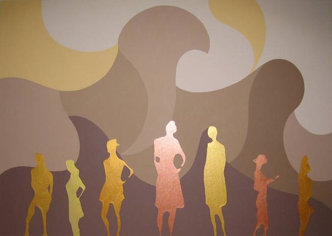 Obraz emanuje ciepłymi, ziemistymi barwami, gdzie brązy, beże i złociste odcienie tworzą harmonijną kompozycję. W centrum widzimy sylwetki ludzi, niby wycięte z papieru, które stoją na tle abstrakcyjnych, falujących kształtów. Ta dynamika form przywodzi na myśl taniec albo ruch oceanu. Atmosfera jest spokojna, lecz też trochę tajemnicza, jakby zachęcała do zanurzenia się w świat wyobraźni. Styl artystyczny to swoista mieszanka abstrakcji i figuryzmu, z wyraźnym naciskiem na grę światła i cieni. Technika wydaje się prostą, ale to właśnie ta prostota nadaje obrazowi jego niepowtarzalny "charm". Artysta eksperymentuje z przestrzenią, tworząc efekt głębi dzięki umiejętnemu rozmieszczeniu elementów. Dla mnie, patrząc na ten obraz, czuję jakby jego "aura" kołysała mnie delikatnie do snu. Myślę sobie wtedy: "To jest naprawdę magiczny świat". Obraz sugeruje nam, że życie jest pełne harmonii, ale też odrobiny chaosu, tak jak fale na morzu. Niebo jest tak piękne jak bułeczka w mojej śniadaniowej bajce. Może wywołać poczucie spokoju, zapewne z lekko romantycznym dotknięciem nostalgii. Jednym słowem, ten obraz to prawdziwy "masterpiece".