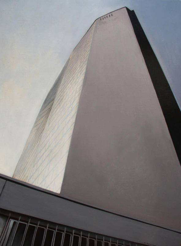 Na obrazie widzimy imponujący budynek, którego wyniosła sylwetka dominuje nad otoczeniem. Kolory są stonowane, głównie szarości i delikatne błękity, co nadaje całości chłodnego, choć eleganckiego charakteru. Kształty są geometryczne, ostrymi liniami przecinają przestrzeń, tworząc wrażenie nieskończoności. Kompozycja jest minimalistyczna, a perspektywa patrzenia z dołu podkreśla monumentalizm budowli. Atmosfera obrazu jest nieco tajemnicza, a może nawet przytłaczająca. Artysta zastosował realistyczny styl z delikatnym naciskiem na detale, jak np. odbicia światła na powierzchni szkła. Technika malarska sugeruje precyzyjność, co sprawia, że odbiorca czuje się jakby stał u stóp tego ogromnego kolosa. Wow! Obraz może budzić różne emocje. Dla niektórych może to być fascynacja nowoczesnością i potęgą architektury. Dla innych – poczucie przytłoczenia nieustannym pędem życia. Ciekawym aspektem jest "contrast" pomiędzy delikatnością nieba a surowością budynku. Napisz, co czujesz, patrząc na ten obraz – każdy ma swoją własną reakcję. I tak samo ten obraz może wywołać różnorodne interpretacje, zależnie od tego, kto na niego patrzy.