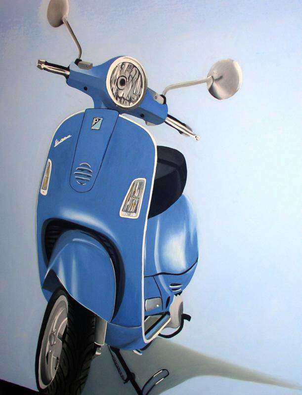 Na obrazie widzimy elegancki skuter, który dominuje całą przestrzeń kompozycji. Błękitny kolor pojazdu przywodzi na myśl letnie dni i świeże powiewy wiatru. Tło, utrzymane w jasnych, pastelowych odcieniach, podkreśla delikatność i lekkość całej sceny. Kształty są wyraźnie zaznaczone, a delikatne refleksy światła nadają skuterowi trójwymiarowości. Atmosfera obrazu jest pełna spokoju, ale i dynamiki. Artysta zastosował technikę realistycznego malarstwa, co widać po precyzyjnym oddaniu detali reflektorów i luster. Mimo to, obraz zachowuje swobodę dzięki subtelnemu rozmyciu niektórych krawędzi. Można poczuć, że to "freedom" w najczystszej postaci - wolność przemierzania ulic miasta. Dzieło budzi w widzu refleksję nad podróżami i codziennymi przygodami. Aż chce się wskoczyć na ten skuter i jechać przed siebie. Może to być symbol młodzieńczej wolności i radości. "Chciałbym mieć taki skuter i pojechać na lody" - to mogłoby powiedzieć dziecko, patrząc na ten obraz. Emocje płynące z dzieła to mieszanka nostalgii i ekscytacji. Personalnie, widząc taki obraz, czuję miły dreszczyk i lekkie marzenia o podróży.
