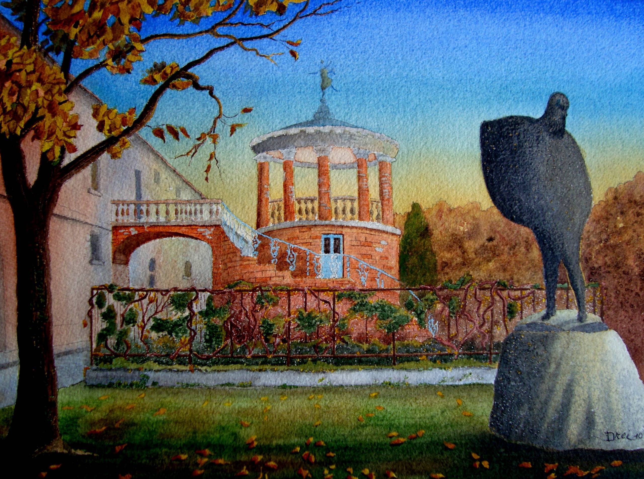 Obraz na pierwszy rzut oka zachwyca bogactwem kolorów i detali. Niebieskie niebo delikatnie przechodzi w ciepły, złocisty zachód słońca. Na pierwszym planie wyróżnia się ciemna, tajemnicza rzeźba na tle malowniczego pawilonu. Budynek z ceglastej czerwieni jest pięknie skontrastowany z białymi balustradami, które nadają mu elegancji. Kształty są miękkie, ale wyraźne, co dodaje głębi kompozycji. Jest to coś jakby połączenie swojskości z odrobiną magii. Atmosfera obrazu emanuje spokojem oraz lekką nostalgią. Może przypominać jesienne popołudnie w parku pełnym historii. Artysta zastosował technikę akwareli, co widać po rozmytych konturach i subtelnych przejściach kolorów. Dzieciaki mówią czasem, że to miejsce z bajki, a ja chętnie bym tam się przeniósł. Styl artysty wywołuje we mnie skojarzenia z impresjonizmem, gdzie uchwycone chwile migoczą w świetle. Patrząc na to dzieło, czuję się jak na magicznym spacerze, i chciałbym się tam znaleźć, choćby na chwilkę. Pamiętajcie, sometimes less is more, a ten obraz doskonale to pokazuje.