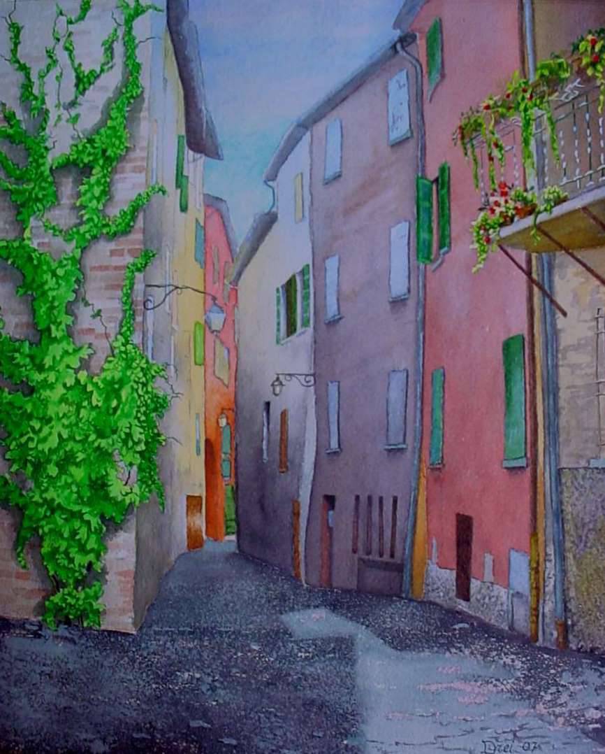 Na obrazie widzimy urokliwą, wąską uliczkę w starym mieście. Pastelowe kolory budynków – od ciepłych żółci i czerwieni po chłodne błękity i szarości – tworzą harmonijną kompozycję. Zielona winorośl pełzająca po ścianach nadaje miejscu żywy akcent. Światło jest miękkie, jakby wczesnym rankiem lub późnym popołudniem, rzucając delikatne cienie na nierówny bruk. To prawdziwy cosy corner, przywodzący na myśl letnią sjestę. Artysta posługuje się techniką akwareli, co podkreśla lekkość i ulotność miejsca. Farby są subtelnie rozprowadzone, niektóre krawędzie zacierają się, nadając kompozycji marzycielski nastrój. Można by rzec, że obraz emanuje spokojem i zaprasza do chwilowego zatrzymania się. Mój kot by tam lubił bawić. Patrząc na ten obraz, czujemy nostalgię, przypominają się wakacyjne spacery, zapachy kawy zza rogu, echo kroków. To miejsce żyje, mimo że jest puste. Imagine yourself sitting in that street, chłonąc ciszę. Uczucie zatracenia się w czasie – niczym niezmącony moment codzienności.