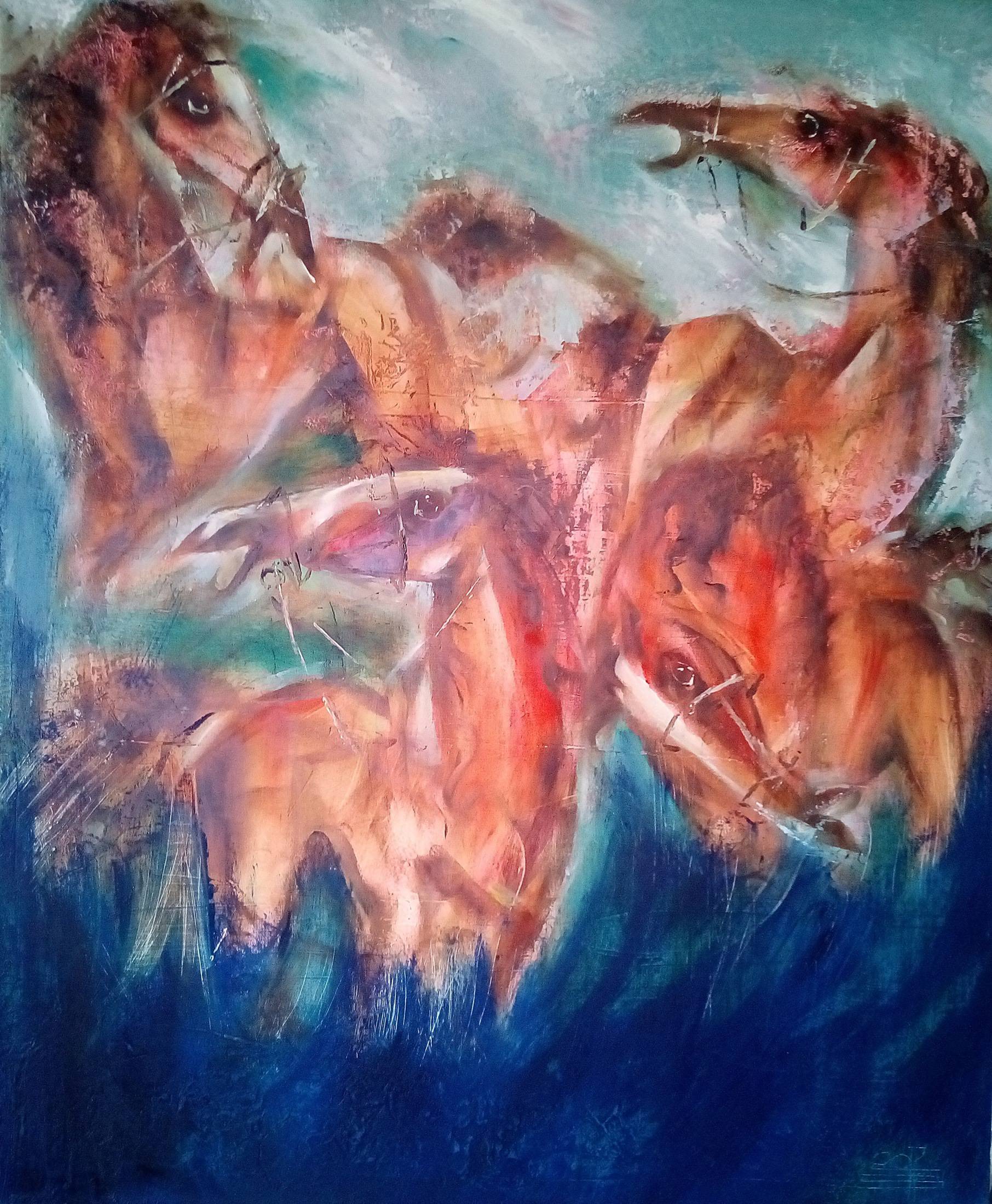 Na tym obrazie wyobraźnia unosi się na falach koloru i formy. Intensywne odcienie błękitu i ciepłe brązy splatają się, tworząc dynamiczną kompozycję pełną ruchu i życia. Konie na obrazie wydają się niemalże wyłaniać z tła, jakby były gotowe do galopu przez płótno. Ich sylwetki zarysowują energiczne linie przypominające nurt rzeki, który niesie z sobą coś więcej niż tylko wodę. Wow, a może to wcale nie konie? Obraz emanuje atmosferą tajemnicy i niepokoju, jakby ukrywał opowieść, która dopiero czeka na odkrycie. Artysta posłużył się techniką przypominającą impresjonizm, z luźnymi pociągnięciami pędzla i subtelną grą światła. Jest w nim coś hipnotyzującego, co przyciąga wzrok i zatrzymuje go na dłuższą chwilę. To like patrzenie na zachód słońca, pełen niespodzianek i ukrytych znaczeń. Dla odbiorcy ten obraz może być źródłem różnych emocji — od zachwytu po zadumę. Można wręcz poczuć pęd i dynamikę zawartą w tej scenie. Ktoś może pomyśleć o wolności i potrzebie ucieczki od codzienności. A dla innego, może to być po prostu piękna kompozycja do podziwiania. To nie tylko sztuka, to podróż.