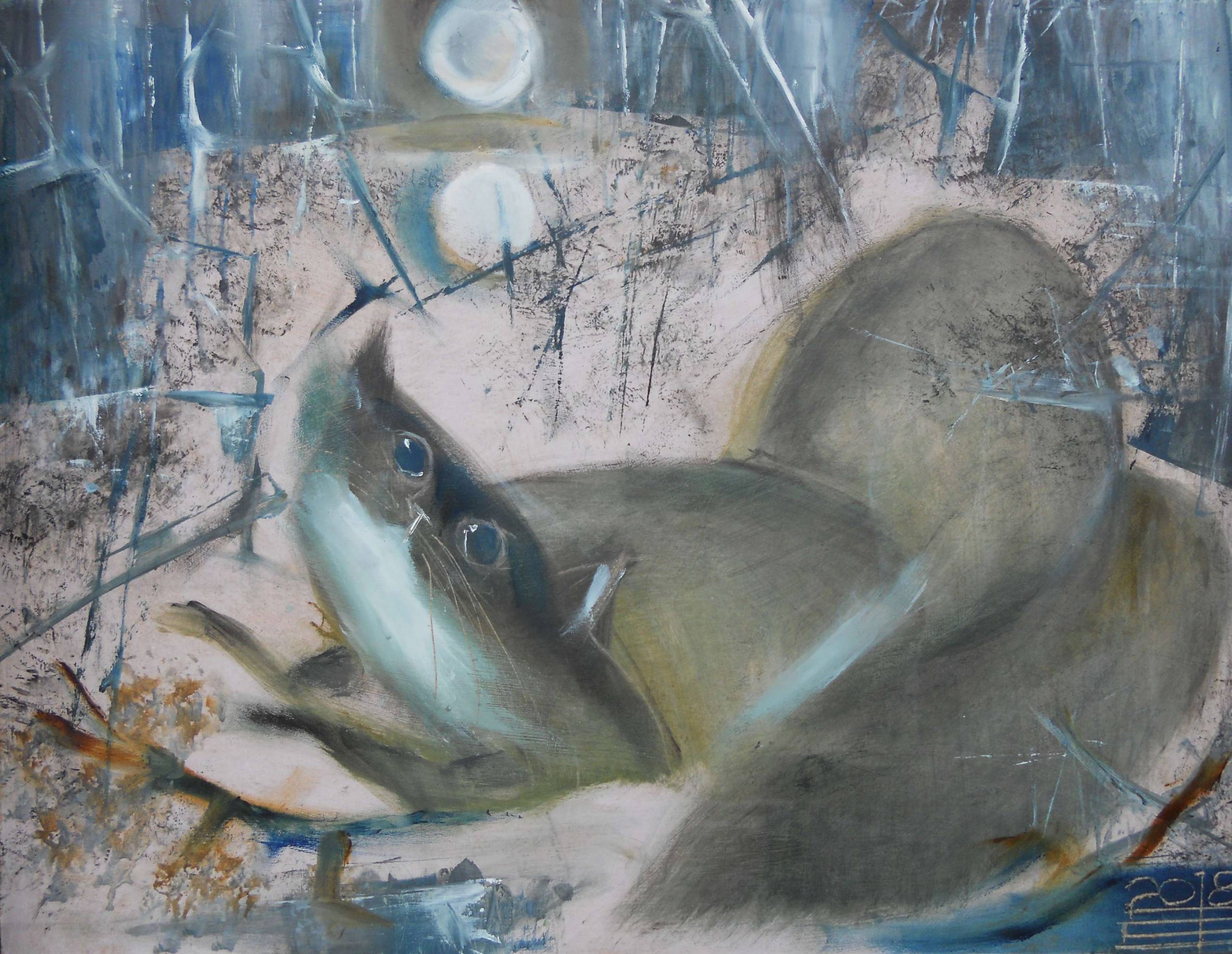 Obraz wyróżnia się tajemniczą atmosferą, łącząc delikatne odcienie błękitu i szarości, które tworzą zimny, lecz intrygujący klimat. Centralną postacią jest kot, którego oczy wydają się błyszczeć, przyciągając uwagę widza jak magnes. Kocie ciało, zarysowane miękkimi liniami, zdaje się wtapiać w rozmazane tło, przypominające abstrakcyjny pejzaż. Technika artystyczna, oparta na akwarelowych plamach i spontanicznych, ostrych pociągnięciach pędzla, dodaje dynamiki i sprawia, że kompozycja jest żywa. Co ja narozrabiałem, pomyślał kot. Obraz, choć spokojny, budzi niepokój – jakby coś ukrytego czaiło się tuż za rogiem. Może to właśnie tajemnica w jego oczach? Patrząc na obraz, odczuwam coś w rodzaju "dreamlike" - jak sen, który przyciąga, choć trochę straszny. Kot na płótnie emanuje pewnym spokojem, ale i subtelną, niedopowiedzianą grozą, jakby świat, w którym żyje, był pełen sekretów. Artysta świetnie balansuje między rzeczywistością a fantazją, zabierając nas w podróż do miejsca, gdzie każda kreska i plamka kryje coś więcej.