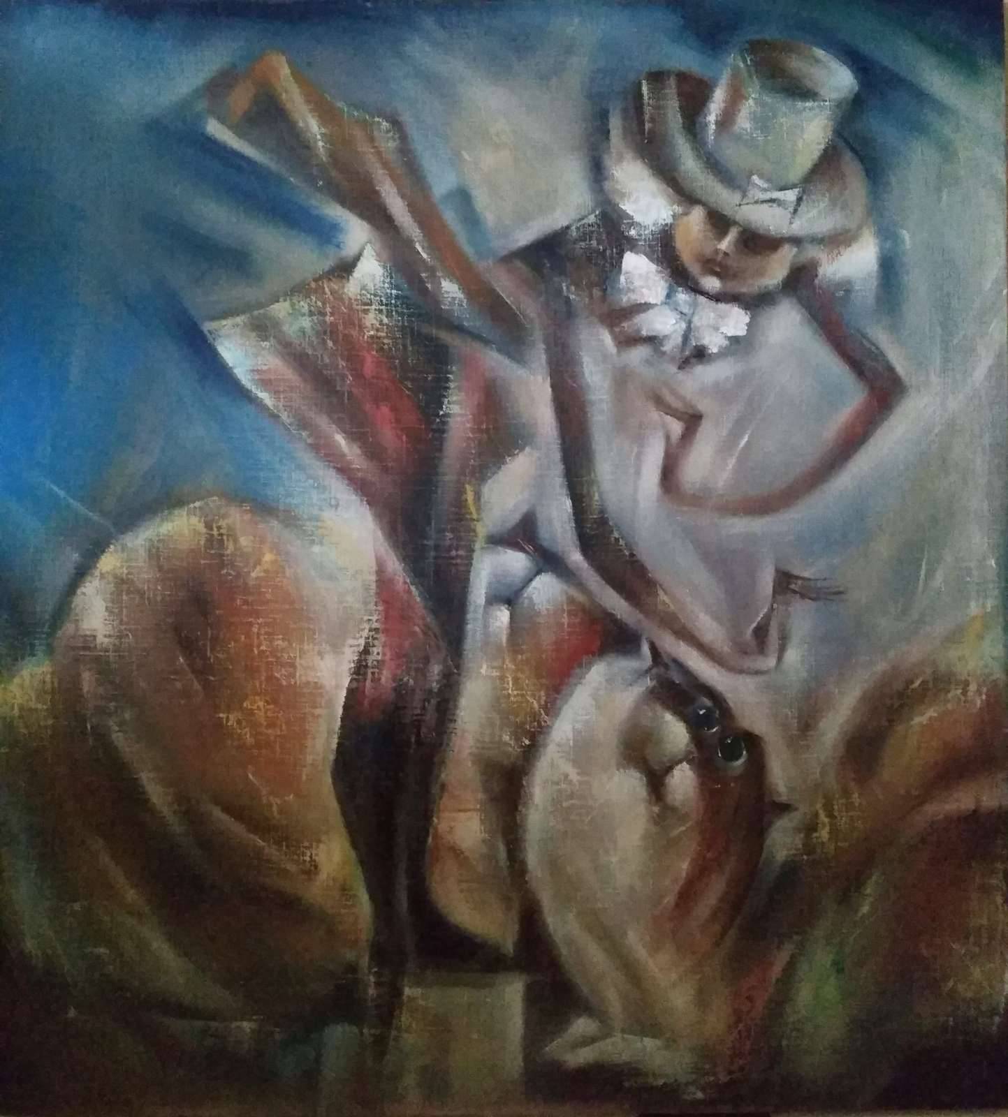 Obraz jest pełen dynamicznych linii i nieregularnych kształtów. Kolory są intensywne i zróżnicowane, dominują głównie odcienie niebieskiego i brązowego. Kompozycja obrazu jest złożona i przyciąga wzrok swoją intrygującą abstrakcyjnością. Można na nim zauważyć postać w cylindrze, pochyloną ku dołowi, co dodaje całości tajemniczości. Atmosfera dzieła jest nieco surrealistyczna, jak w bajce gdzie wszystko jest possible! Styl obrazu przypomina dzieła kubistyczne, z widocznymi ostrymi krawędziami i zdeformowanymi formami. Artysta operuje technikami, które skupiają się na przesunięciu perspektywy i pozwalają oglądającemu interpretować obraz na różne sposoby. Wywołuje to mieszane emocje – od ciekawości, przez zdziwienie, aż po nutkę niepokoju. Dziecko mogłoby powiedzieć, że to magia ukryta w farbach i pędzlu! Osobiście czuję, że obraz opowiada historię z pogranicza snu i jawy. Może symbolizować wewnętrzną walkę lub poszukiwanie czegoś nieuchwytnego. Fascynuje i skłania do refleksji, choć jednocześnie pozostawia pewną niewiadomą. Sztuka tu ożywa, a każdy element wydaje się gwiazdą w tajemniczym spektaklu.