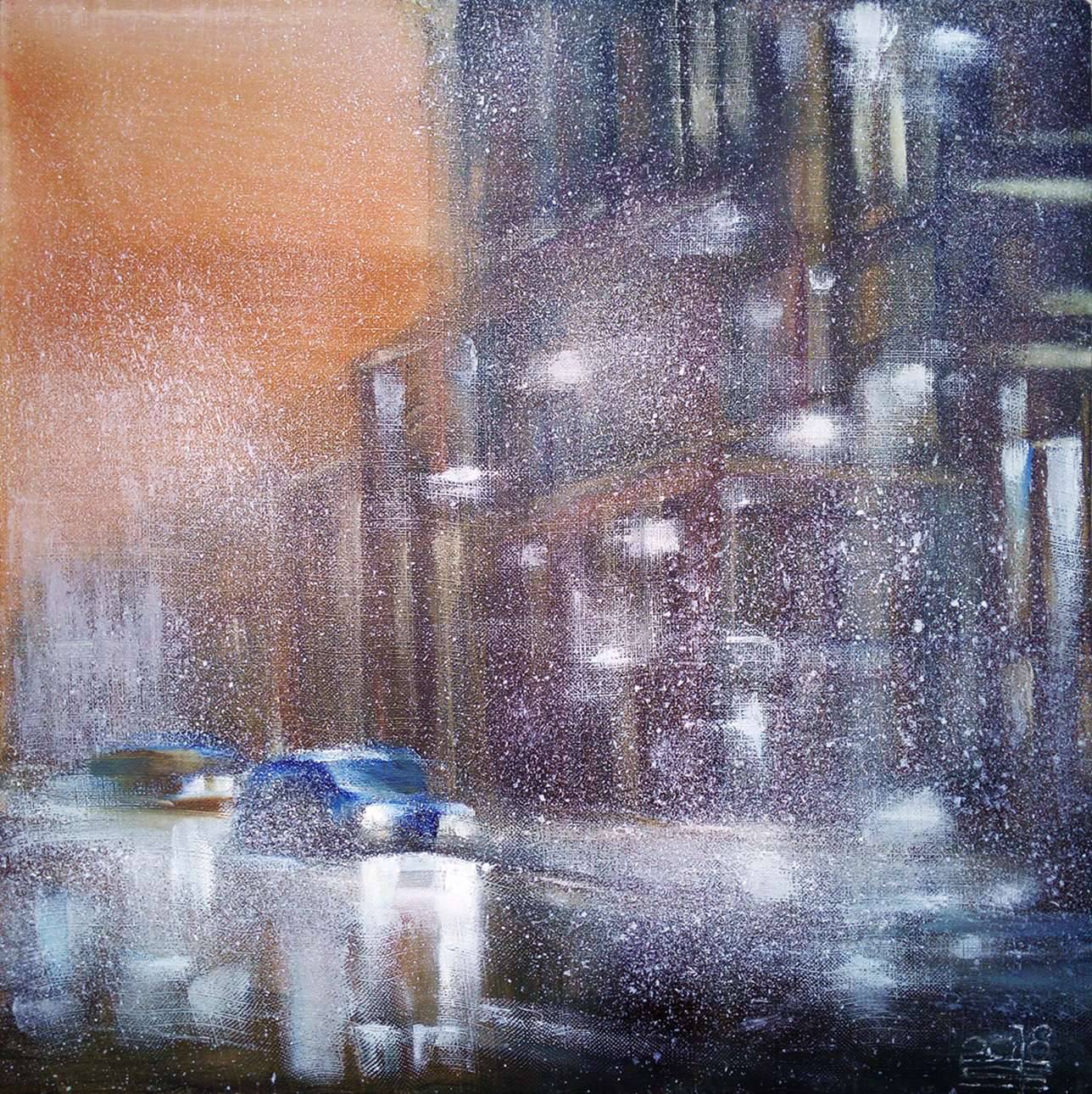 Na obrazie widzimy wieczorną scenę miejską. Deszcz delikatnie osiada na asfaltowej ulicy, tworząc magiczne refleksy świateł latarni i pobliskich budynków. Kolory są stonowane, dominuje tu zgaszony pomarańcz, szarości i biele, co dodaje tajemniczości całej kompozycji. Wyraziste zarysy budynków rozmywają się w tle, co sprawia wrażenie sennej poświaty. Auta śmigają po wilgotnej drodze, ich światła tworzą dynamiczne akcenty w statycznej oprawie. Atmosfera obrazu jest melancholijna. Powiew nostalgii przewija się przez to dzieło, jak wiatr przez opustoszałe ulice. Artysta wykorzystał technikę impasto, aplikując farbę w sposób, który dodaje tekstury i głębi każdemu elementowi. Dynamiczne pociągnięcia pędzla sugerują ruch, a jednocześnie nadają obrazowi impresjonistycznego charakteru. Patrząc na to, można poczuć ciepły spokój, ale też pewną samotność wielkiego miasta. Czy to nostalgia za minionym czasem? Obraz wywołuje w widzu refleksje nad codziennym pośpiechem i urokami zatrzymania się na chwilę. Światełka migoczą jak christmas lights, co dodaje scenie odrobinę magicznej atmosfery. Mówiąc szczerze, spojrzenie na tę scenę przypomina mi chwile, kiedy wracałam do domu w deszczu, czując się jak bohaterka własnej opowieści. A dziecko powiedziałoby, że auta bawią się w chowanego w kropelkach deszczu.