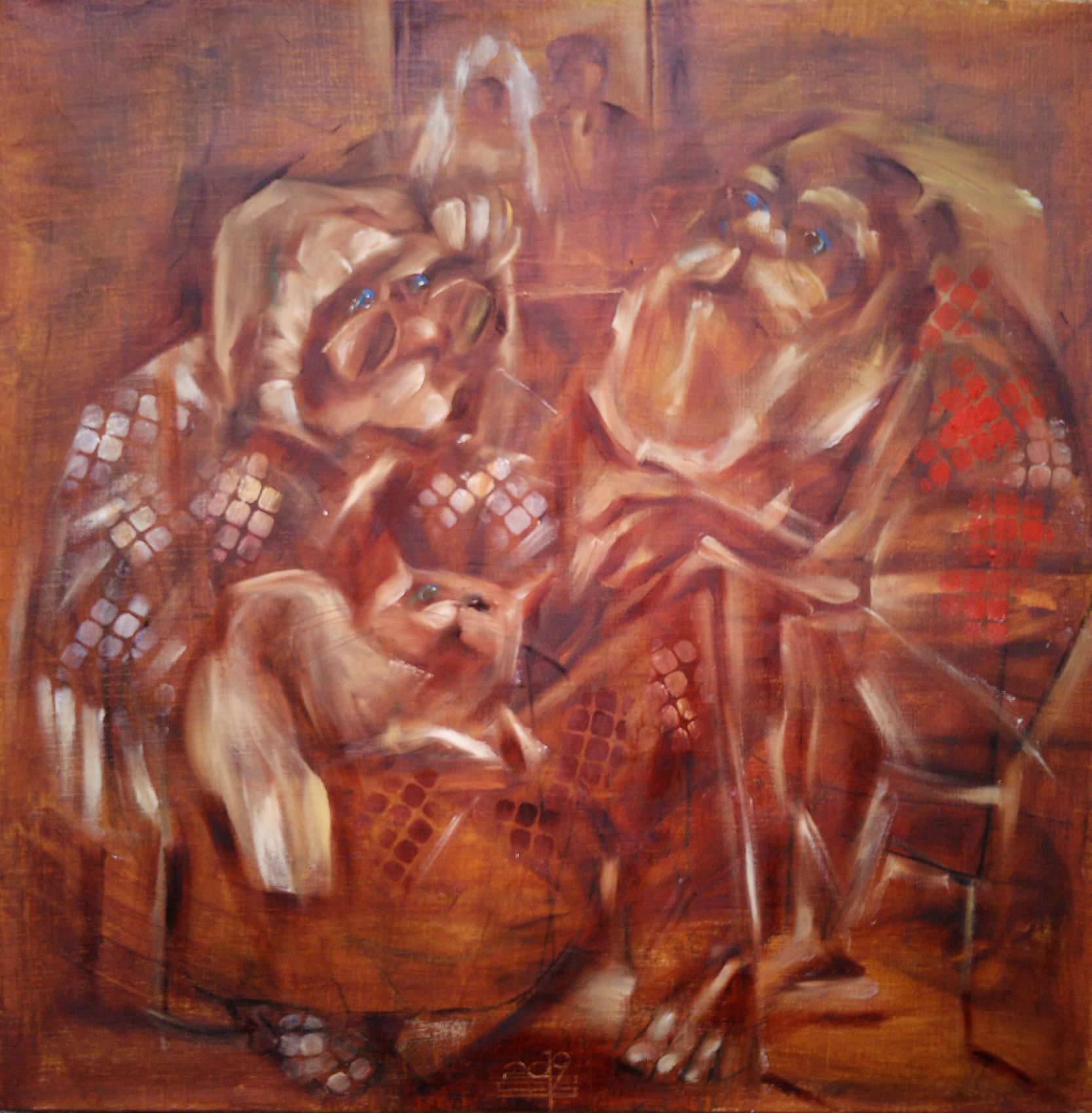 Obraz emanuje ciepłem i nostalgią, ukazując dwoje starszych postaci otoczonych domowym zwierzakiem. Dominują brązy i ciepłe odcienie, które tworzą przytulną i spokojną atmosferę. Kształty są nieco rozmyte, jakby artysta chciał, byśmy skupili się bardziej na uczuciach niż na szczegółach. Technika zastosowana przez twórcę zdaje się łączyć impresjonizm z delikatnym surrealizmem, nadając całości prawie dreamlike wygląd. Starsza pani w okularach spogląda z uśmiechem, jakby opowiadała starą anegdotę. Obok niej kotek, który zwija się w kłębek, dodając obrazowi ciepła i humoru. "Lubię kotki" - powiedziałoby dziecko, patrząc na to dzieło. Widz może poczuć falę nostalgii, może nawet smutek, przypominający chwile spędzone z bliskimi. Obraz prowokuje do refleksji nad upływem czasu i wartością rodzinnych wspomnień. Dla mnie, to little piece of home.