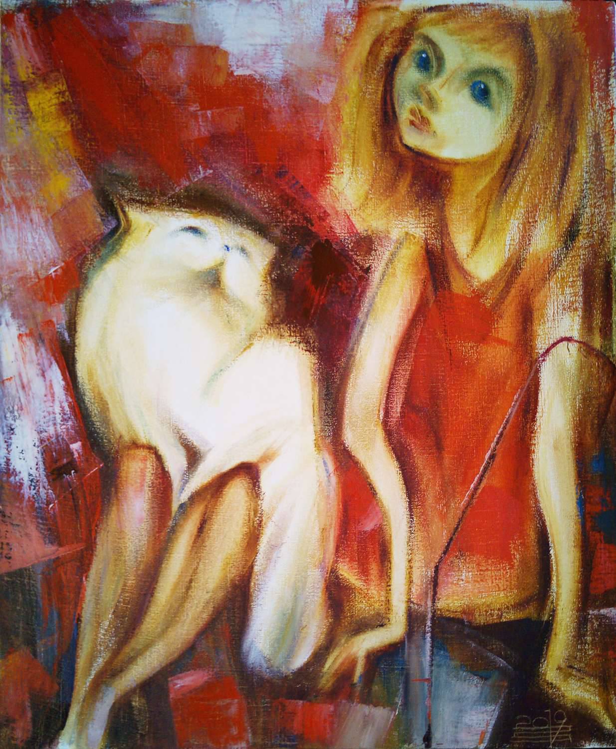 Obraz przedstawia dziewczynkę i kota w magicznej aurze zdominowanej przez ciepłe odcienie czerwieni, pomarańczu i żółci. Kolory płynnie przechodzą jeden w drugi, tworząc dynamiczny efekt wizualny. Dziewczynka spogląda na widza z wyrazem zaciekawienia i niewinności. Jej duże, błękitne oczy przyciągają uwagę, stanowiąc kontrast dla dominujących ciepłych barw. Obok niej siedzi biały kot o spokojnym wyrazie, jakby był strażnikiem sekretów, które para dzieli. Kompozycja jest swobodna, niemal malarska, a artysta wykorzystuje technikę impresjonistyczną, z luźnymi pociągnięciami pędzla. Nastrój dzieła jest nostalgiczny i pełen marzeń. Można poczuć, jakby czas zatrzymał się na chwilę, dając przestrzeń do refleksji. To obraz, który wywołuje uśmiech i wewnętrzne ciepło. "Look! Kotek!" – tak mógłby krzyknąć podekscytowany siedmiolatek widząc to dzieło. Technika zastosowana przez artystę jest nonszalancka, z elementami abstrakcji, co dodaje całości lekkości i nieco dreamlike quality. Każdy patrzący na obraz może zanurzyć się w jego atmosferę, odnajdując własne historie i wspomnienia. Ciekawe, jakie tajemnice kryje ta dziewczynka i jej koci towarzysz. Obraz zaprasza odbiorcę do kontemplacji, pobudzając wyobraźnię i pozostawiając miejsce na własne interpretacje. Patrząc, czujemy się jak w świecie snów, gdzie wszystko jest możliwe i pełne magii.