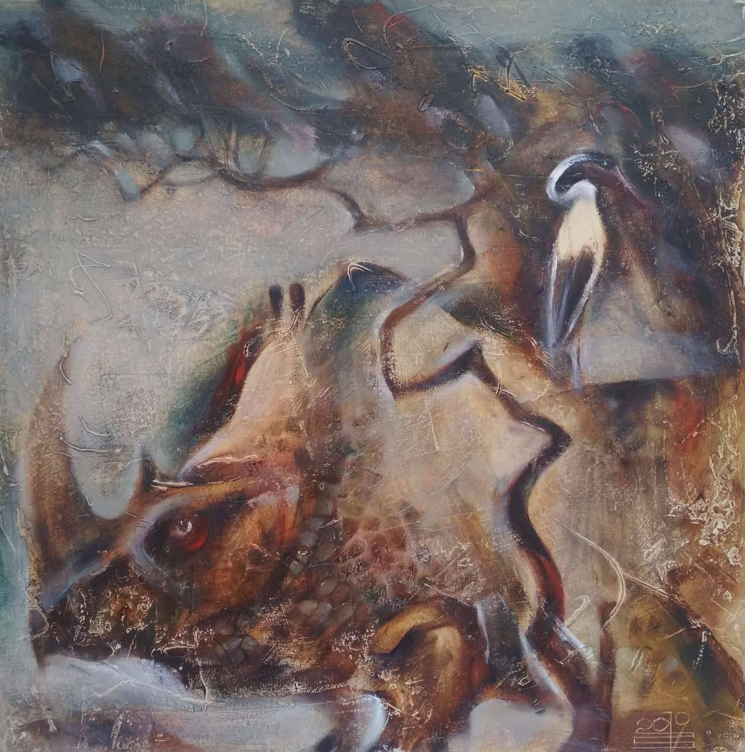 Obraz emanuje tajemniczym nastrojem, pełnym mistycyzmu i zaskakujących zwrotów. Dominują głównie ciepłe barwy - brązy, zgaszone czerwienie, a także chłodne odcienie niebieskiego i szarości. Kompozycja jest dynamiczna, kształty przenikają się, tworząc iluzję ruchu. Na pierwszy rzut oka można dostrzec sylwetkę ptaka, którego biel kontrastuje z otaczającymi ciemnymi tonacjami. Artysta zastosował tu technikę światłocienia, która dodaje głębi i trójwymiarowości. Styl obrazu jest abstrakcyjny, lecz nie brakuje realistycznych elementów, które prowokują do refleksji. Patrząc na to dzieło, można poczuć emocje - fascynację nieznanym, a może nawet lekką nostalgię. Jest tu coś, co przyciąga wzrok i każe zastanowić się nad symboliką. "Wow, ten ptak jest jak z bajki!" - takie zdanie mogłoby wypowiedzieć dziecko, bowiem obraz w swej formie ma coś z dziecięcej wyobraźni. Patrząc na to, można poczuć, jak artysta bawił się kolorami i kształtami, tworząc coś w rodzaju dreamscape, coś surrealistycznego. To dzieło to prawdziwy rollercoaster optymalny dla wyobraźni. Czuć w nim pewną lekkość, ale i skomplikowanie, jak puzzle, które chce się rozwiązać. Taki obraz to "one of a kind", unikatowy w swym przekazie. Fajnie byłoby mieć go na ścianie i codziennie odkrywać coś nowego.