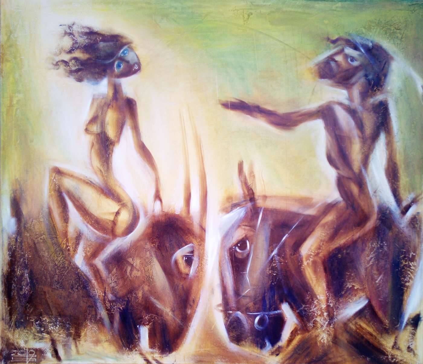 Na obrazie przedstawiono parę postaci o falujących, abstrakcyjnych kształtach, siedzących na majestatycznych bykach. Kolory są ciepłe, dominują odcienie złotego i brązu, co nadaje całej scenie aurę tajemniczości i spokoju. Tło jest lekko rozmyte, co sprawia, że główne postacie zdają się być zanurzone w jakimś magicznym, nierealnym świecie. Fajnie, jakby tak można było naprawdę jeździć na bykach! Atmosfera obrazu jest nieco nostalgicczna, a zarazem pełna dynamiki. Można by rzec, że widoczna jest pewna płynność i ruch, jakby postacie zaraz miały wyruszyć w dalszą podróż. Artystyczny styl jest impresjonistyczny, z nutą surrealizmu. Artysta operuje szerokimi pociągnięciami pędzla, a linie są miękkie i delikatne. Takie podejście dodaje całości dream-like quality, gdzie rzeczywistość miesza się ze snem. Obraz ten wywołuje różnorodne emocje. Może wzbudzić refleksję nad wolnością i niezależnością, ale także pewną tęsknotę za nieosiągalnym. Zastanawiam się, co te postacie myślą... Może odkrywają nowe światy? Każdy, kto patrzy na to dzieło, może dostrzec coś innego, w zależności od własnych doświadczeń i emocji.