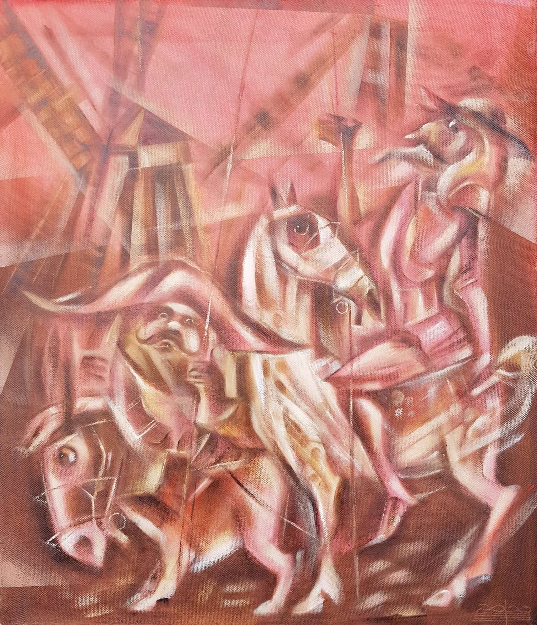 Obraz tchnie magią subtelnych różowych tonów, z delikatnymi przejściami do brązów. Koń i postać na nim, wydają się jakby wyjęte z mgły dawnych czasów, co tworzy ten surreal look. Kompozycja jest pełna dynamicznych linii, które delikatnie zakreślają formy dwóch jeźdźców. Forma jest rozmyta, ale jednocześnie precyzyjna. Nastrojowa atmosfera przywodzi na myśl poczucie podróży w nieznane. Wydaje się, że artysta użył techniki przypominającej kubizm. Kształty są tutaj tajemnicze, nieuchwytne, przez co każdy może inaczej je zinterpretować. To jak wciągająca (a wręcz uzależniająca) łamigłówka dla oka i duszy. Czujesz się, jakbyś zapadał w spokojny sen, który jednocześnie tętni przygodą. Odbiorcy mogą poczuć, jak coś delikatnego trąca ich serce. Patrząc na to, myślę sobie: "Ojej, to jak z bajki". Dzieło przyciąga ciepłą nostalgią, ale nie brakuje tu też lekkości ducha. Ma w sobie coś jak journey do krainy wyobraźni.
