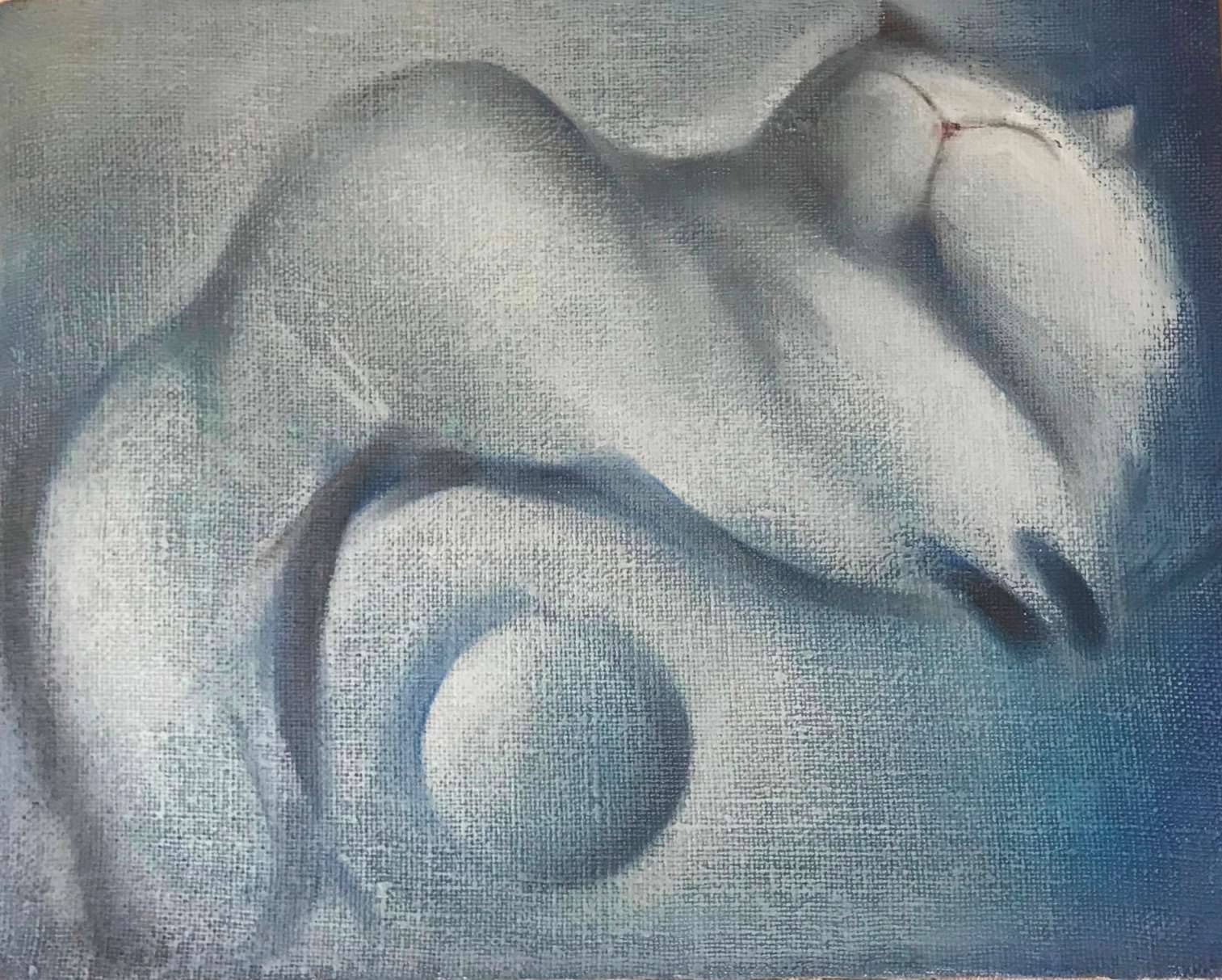 Na obrazie widać delikatne, pastelowe odcienie błękitu i szarości, które płynnie łączą się w harmonijną kompozycję. Główna forma przypomina miękko zaokrąglone kształty, które zdają się unosić w przestrzeni. Kompozycja jest jak senna mara, pełna subtelnych przejść i lirycznych lini. Atmosfera tego dzieła jest niezwykle spokojna, jakby czas zwolnił na chwilę. Artysta zastosował technikę, która przypomina rozmyte pociągnięcia pędzla, dodające obrazowi impresjonistycznej tajemniczości. Można by to nazwać jednym słowem: dreamy. Uczucie, jakie wzbudza, jest niczym poczucie beztroski podczas leniwego popołudnia. Mój kotek też tak śpi jak na obrazku! Obraz może wzbudzać w odbiorcy emocje ciepła i ukojenia, przypominając delikatnie o ulotnych chwilach codziennej harmonii. Kiedy tak patrzę na te płynne formy, myślę sobie o nieskończoności snów, a może i o tym, co nieuchwytne. Ta praca to jak cichy szept z innego świata, który kusi swoją prostotą i tajemnicą. Czy to nie jest magiczne?