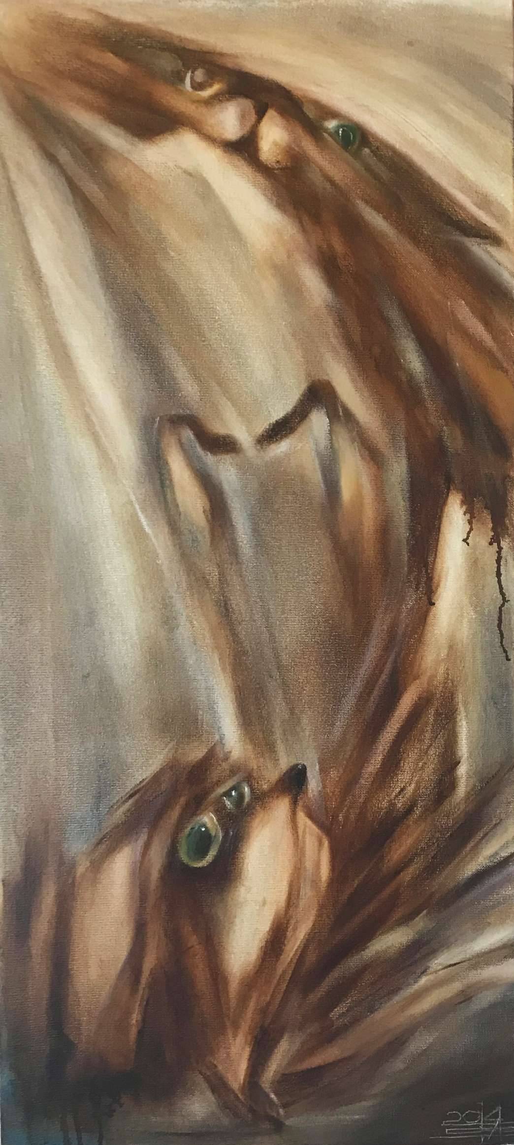 Obraz emanuje subtelnym połączeniem odcieni brązu, złota i zieleni, tworząc dynamiczny pejzaż pełen ruchu i energii. Kształty są płynne i wibrujące, jakby artysta zatrzymał na moment burzliwy taniec natury. Oczy postaci - duże, zielone jak smaragdy - przyciągają uwagę i nadają kompozycji głęboki, introspektywny charakter. Atmosfera jest tajemnicza, trochę jak w magicznym lesie, gdzie wszystko żyje własnym życiem. Styl obrazu przypomina nieco impresjonizm zmieszany z surrealizmem. Pędzle artysty wiją się po płótnie, tworząc płynne przejścia i dynamiczne linie. Jest w tym coś z contemporary art, ale z korzeniami głęboko w tradycji. To dzieło pobudza wyobraźnię i może wywoływać różnorodne emocje - od zdziwienia po zachwyt. Obraz może być interpretowany jako odzwierciedlenie złożoności życia wewnętrznego. Ciepłe barwy kojarzą się z poczuciem bezpieczeństwa, ale również z tajemnicą. Mały chłopczyk mógłby powiedzieć: "Ojej, ale tu dużo się dzieje!" To dzieło tworzy przestrzeń do refleksji nad własnymi emocjami. Mając taki obraz przed sobą, trudno się nim znudzić. Jego tekstura mówi "feel me", bo aż chce się jej dotknąć. Wpatrując się w to dzieło, można odkrywać nowe szczegóły za każdym razem, co stanowi jego niezaprzeczalny urok.
