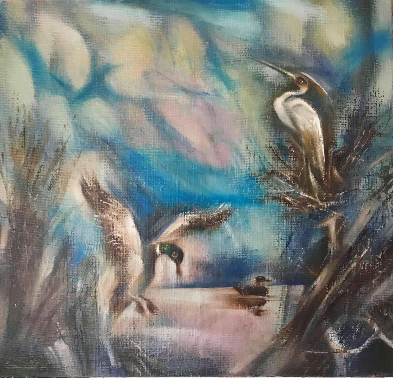Obraz to magiczny kolaż kolorów i kształtów, gdzie dominują błękity i pastelowe odcienie różu. Dwa ptaki, subtelnie zarysowane, są głównymi bohaterami tej sztuki. Jeden ptak dumnie siedzi w gniazdku, a drugi jakby szykował się do lotu. Kompozycja ma w sobie coś z marzenia sennego, coś ulotnego. Tło, niewyraźne, zdaje się oddychać i pulsować kolorami. Można prawie poczuć, jak się porusza. Obraz przywodzi na myśl melancholię i refleksję, ale i pewną spokojną radość. Artysta zastosował rozmyte pociągnięcia pędzla, łącząc technikę impresjonistyczną z czymś bardziej swobodnym, jakby nic tu nie było do końca zobowiązujące. Widz ma wrażenie, że znajduje się na granicy jawy i snu. "Wow, ptaszki latają!", powiedziałoby dziecko. To dzieło sprawia, że człowiek chce się na chwilę zatrzymać i popatrzeć. Może nawet zamknąć oczy i dać się porwać tej atmosferze. Ciekawe jest, jak barwy wpływają na naszą wyobraźnię, tworząc przeróżne "stories" w naszej głowie. Patrząc na obraz, czuję miły spokój, ale jednocześnie troszkę tęsknoty za tym, co ulotne i nieuchwytne. Jest w tym coś "dreamlike", co nie daje o sobie zapomnieć.