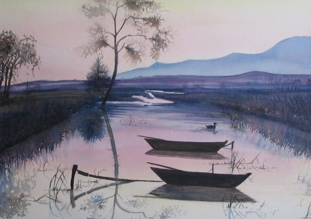 Na tym malowidle króluje spokojna scena, gdzie woda i niebo zdają się płynnie zlewać w jedno. Dominują chłodne odcienie błękitu i fioletu, przełamane delikatnym różem nieba o zmierzchu. Sylwetki dwóch łódek, unoszących się na cichej tafli wody, dodają temu obrazowi nostalgiczną nutę spokoju. Drzewo na brzegu, niemal nagie, rzuca swoje odbicie na powierzchnię wody, tworząc subtelną symetrię. W oddali góry kształtują linię horyzontu, ledwie widoczne w delikatnej mgiełce. Artysta zastosował technikę akwareli, co nadaje całości lekkość i dodaje ethereal quality. Atmosfera tej pracy jest absolutnie kojąca, jakby czas zwolnił tylko po to, by pozwolić nam na chwilę refleksji. Ta cisza, te łagodne barwy, emanują spokojem. Obraz może budzić uczucie tęsknoty za prostotą i harmonią z naturą. Przywodzi na myśl leniwe wieczory przy cichej wodzie. "Tam bym popływał!" - krzyknęłoby dziecko, oglądając tę scenę. Rozmyte kontury i płynne przejścia kolorystyczne podkreślają ulotność chwili uchwyconej na papierze. Są tu emocje, które rozbudzają w nas chęć zatrzymania się na moment, zanurzenia się w tym idyllicznym pejzażu.