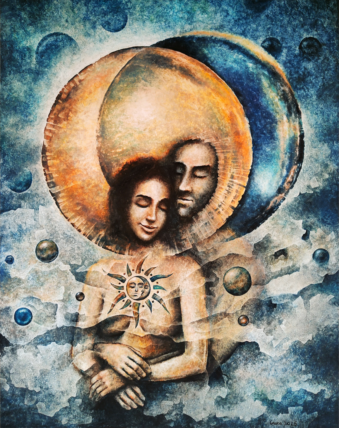 Obraz tonie w chłodnych błękitach i granatach. A na ich tle rozkwita wielki podwójny krąg jak słońce i księżyc naraz. Ciepłe ochry i miedziane światło oblewają dwie twarze wtulone w siebie. Oczy zamknięte. Usta ledwo w uśmiechu. Kompozycja jest centralna i spokojna, a drobne planety. kropki. kule. pływają wokół jakby bez grawitacji. Technika wygląda na akwarelową z fakturą papieru i przetarciami, trochę jak collage, miękkie przejścia i szorstkie plamy farby robią robotę. Nastrój jest senny i intymny, taki cichy kosmos, gdzie nic nie trzeba mówić. Ja bym tam został na chwile, serio. Na piersi postaci świeci symbol słońca z twarzą, to daje vibe sacred. Dziecko by powiedziało. Oni się przytulają i jest fajnie. Obraz budzi czułość, ale też lekki smutek, jak wspomnienie które troche ucieka.