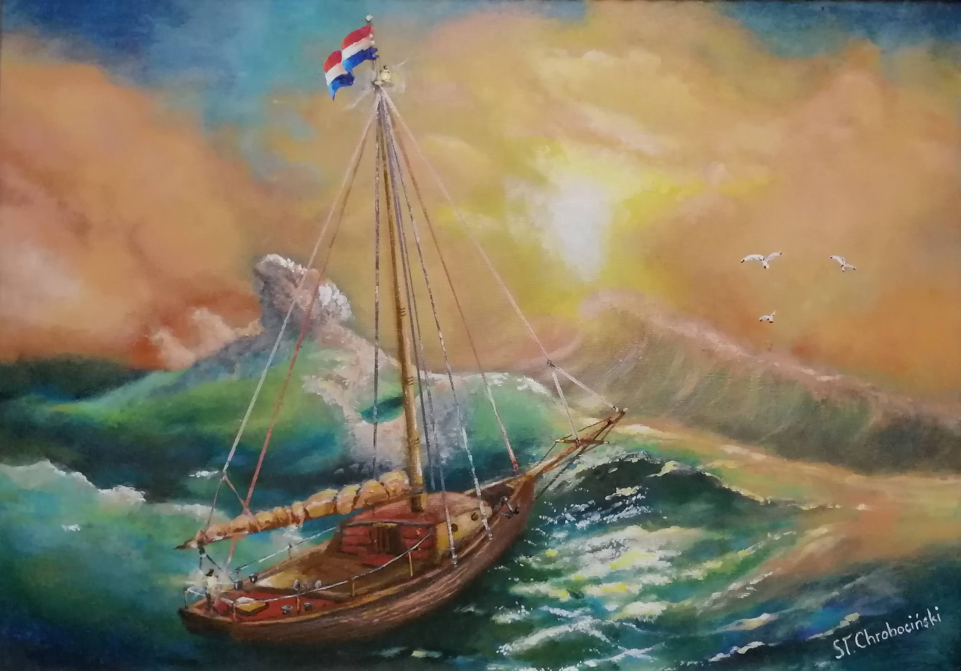 Na obrazie widzimy majestatyczny żaglowiec, płynący przez wzburzone morze. Kolory są intensywne, pełne głębokich odcieni zieleni i błękitu, które kontrastują z ciepłymi, złocistymi promieniami zachodzącego słońca. Fale uderzają o burty statku, tworząc białą pianę, a na horyzoncie dostrzegamy potężną chmurę unoszącą się nad wodą. Łódź zdaje się walczyć z żywiołem, co nadaje kompozycji dynamikę i napięcie. Jest tak pięknie i strasznie. Atmosfera obrazu wręcz tętni niebezpieczeństwem i przygodą. Artysta zastosował technikę impasto, nadając fakturze wody dodatkowej głębi. Można niemal poczuć chłód bryzy morskiej. Taki krajobraz inspiruje do refleksji, przypomina o nieprzewidywalności natury. Czuję, jakby statek był pełen opowieści. Patrząc na to dzieło, można poczuć dreszcze. To prawdziwe "adventure" zaklęte na płótnie. Ale fajne. Obraz prowokuje do myślenia o naszych własnych życiowych podróżach, o walce z przeciwnościami. Wiesz, czasem nawet 7-latek dostrzeże, że morze jest duże i potężne. Zestawienie kolorów i dynamiczna kompozycja sprawiają, że nie można oderwać wzroku. To jakby spojrzenie w serce sztormu, pełne emocji i niepokoju. I myślę sobie, jak piękne może być pokonywanie własnych fal wewnątrz nas. W jakimś sensie to obraz o marzeniach i ich niesforności. Magiczne uczucie, prawda?
