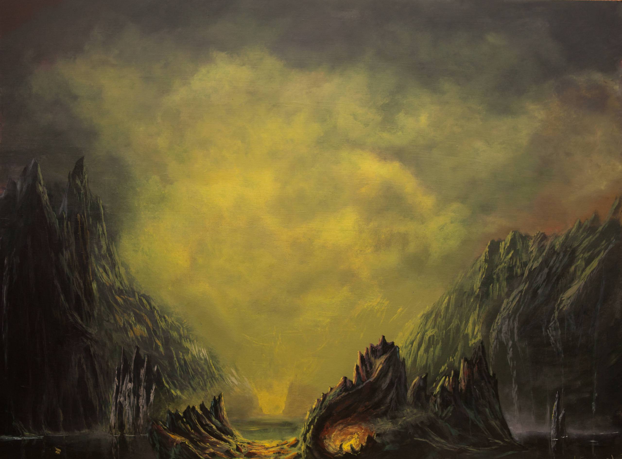 Na obrazie dominuje tajemnicza paleta ciemnej zieleni i żółtego, tworząc atmosferę pełną napięcia i niepokoju. Góry, o ostrych i nieregularnych kształtach, wyłaniają się z obu stron, prowadząc wzrok ku centrum, gdzie żółta mgła zdaje się wypełniać powietrze. To jak podróż do innej, trochę scary krainy. Kompozycja jest dynamiczna, a jednocześnie pozostająca w równowadze, dzięki czemu przyciąga uwagę i zachęca do głębszej analizy. Obraz emanuje aurą tajemniczości. To jakbyśmy oglądali planetę nieznaną ludzkości. Artysta wykorzystał technikę impresjonistyczną, z subtelnymi pociągnięciami pędzla tworzącymi iluzję ruchu w statycznej naturze. Nasycenie kolorów przyciąga uwagę i skłania do refleksji. Could this be an alien landscape? Odbiorca może poczuć się jak odkrywca stąpający po nieznanych ziemiach. Praca porusza wyobraźnię, zmuszając do zastanowienia się nad nieznanym. Można niemal usłyszeć szept wiatru między ostrymi skałami. Wow, to naprawdę fajne. Trombańskie użycie ciemnych, głębokich tonów prowadzi do emocjonalnego uniesienia i refleksji nad nieznanym pięknem przyrody.