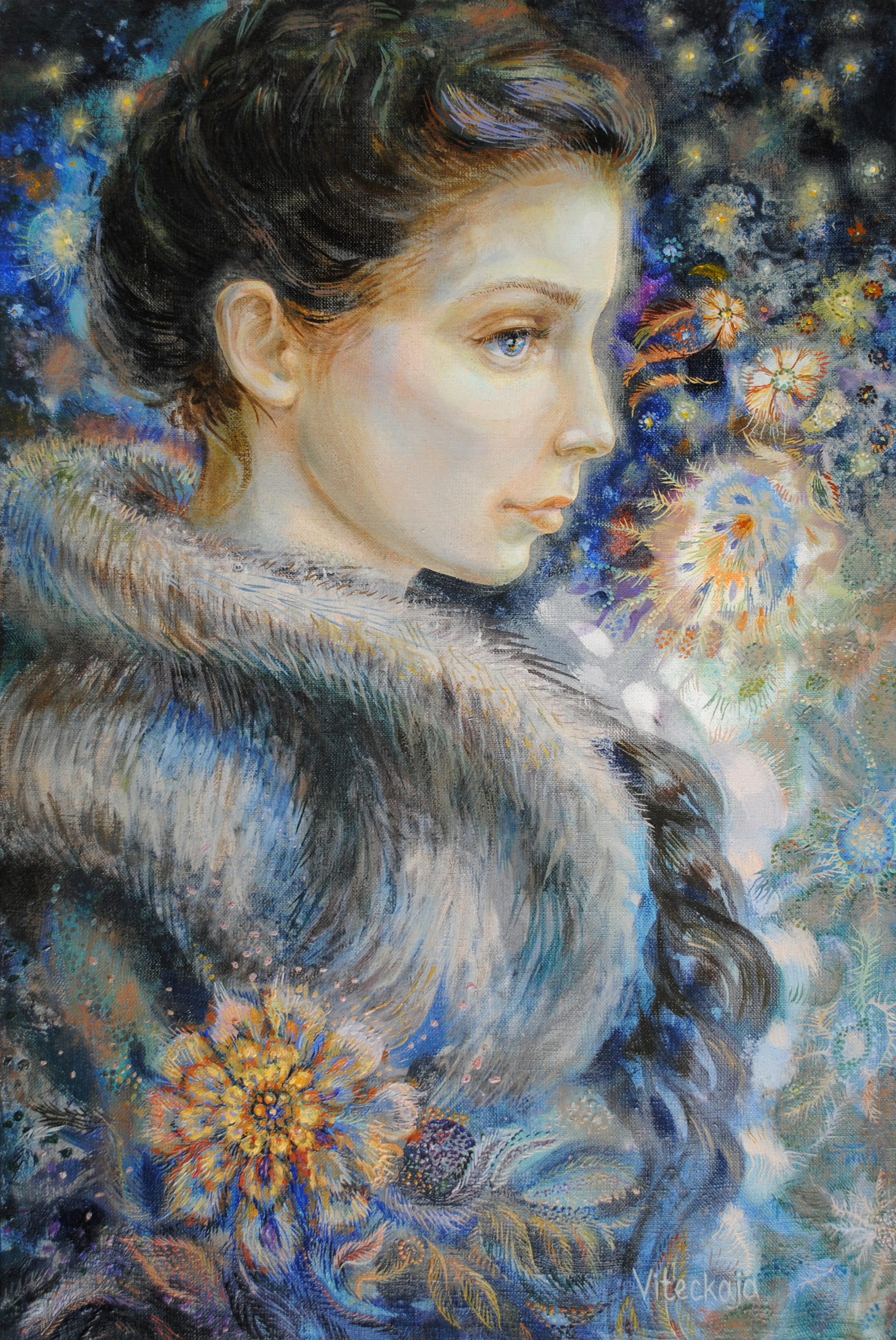 Na obrazie widnieje postać dziewczyny, której spojrzenie pełne jest tajemniczej zadumy. Jej profil otaczają fantastyczne kwiaty, które jakby tańczą wśród nocnych odcieni granatu i turkusu. Te barwy nadają kompozycji głębię i magiczny charakter. Uwagę widza przyciąga niezwykły kwiat o ciepłych, słonecznych odcieniach. niesie ze sobą znaczenie utwierdzania nadziei. Rozkwit delikatnego życia w obcym środowisku, nieorganicznym dla delikatnego kwiatu. Obraz emanuje spokojem i delikatnością, a jednocześnie kryje w sobie nutę tajemnicy. Artystka zestawia realistycznie oddane rysy twarzy z surrealistycznym tłem, tworząc surreal experience. Feeria barw, dynamiczne pociągnięcia pędzla i faktura farby nadają dziełu życie. Użycie akcentów świetlnych przypomina blaski gwiazd, które rozświetlają nocne niebo. To obraz, który porusza serce i wyobraźnię, zmuszając do zatrzymania się na chwilę. Takie dzieła sprawiają, że sztuka staje się podróżą do wnętrza naszej duszy.