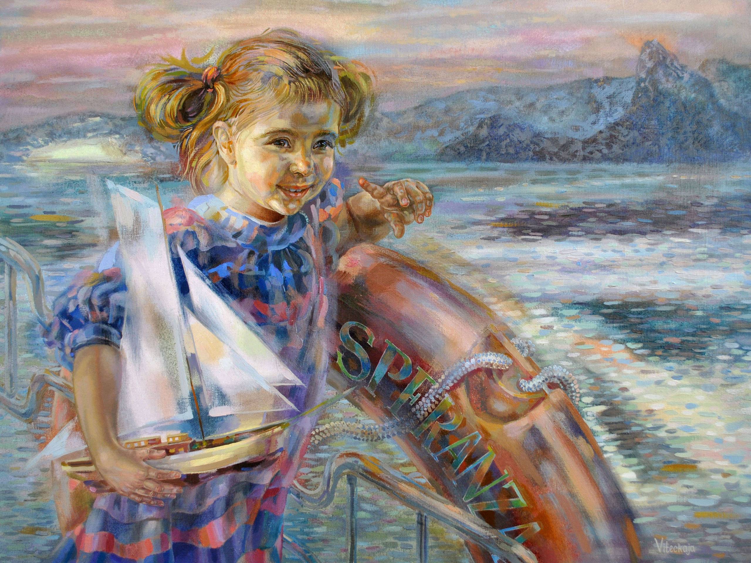 Na obrazie widzimy urocze dziecko, o jasnych włosach związanych w dwa kucyki. Dziewczynka trzyma zabawkowy żaglowiec, a jej twarz rozświetla promienny uśmiech. To chyba najbardziej urocza rzecz, jaką można zobaczyć. Dominują pastelowe kolory – odcienie różu, niebieskiego i zieleni, które subtelnie mieszają się, tworząc lekki, niemal magiczny nastrój. Tło obrazu to spokojne jezioro, na którym odbijają się rozmyte, bajkowe barwy nieba. Widać góry w oddali, ukryte w delikatnej mgiełce. Kompozycja obrazu jest dynamiczna, z centralnym punktem skupionym na dziewczynce i łodzi. Artysta zastosował technikę impresjonizmu, z wyraźnymi pociągnięciami pędzla i grą światła, co dodaje całości głębi. Obraz emanuje radością i niewinnością dzieciństwa, przypominając o beztroskich chwilach spędzanych na zabawie. "To wygląda jak zabawa nad morzem!" powiedziałoby dziecko. Obraz może budzić w odbiorcy uczucie nostalgia za latem i beztroskimi chwilami. Jest coś magicznego, a nawet "dreamy" w tym ujęciu chwili. Taki widok potrafi zakręcić łezka w oku, przypominając o szczęściu ukrytym w codziennych momentach, które często umykają naszej uwadze.