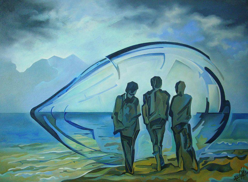 Na obrazie widzimy trzech sylwetkowych postaci kroczących wzdłuż plaży. Kolory są stonowane, dominują niebieskości i szarości, przeplatane subtelnymi nutami beżu. Tło przypomina nieco surrealistyczne pejzaże, z falami delikatnie rozbijającymi się o brzeg. W centrum dzieła zauważamy ogromną przezroczystą muszlę, która wydaje się chronić te osoby. Kompozycja jest dynamiczna, niemal wciąga nas do środka tej tajemniczej sceny. Atmosfera obrazu jest jednocześnie urocza i odrobinę niepokojąca. Gdzieś z tyłu głosu słychać szum morza. Styl artystyczny przypomina coś z pogranicza abstrakcji i impresjonizmu. Widać swobodne pociągnięcia pędzla, a technika gry ze światłem i cieniem dodaje głębi. Dzieło może budzić różne emocje. Z jednej strony poczucie spokoju, jaki daje nadmorski krajobraz, z drugiej tajemnicę i refleksję nad sensem życia. Ktoś mógłby zapytać, "Czy my też jesteśmy częścią większej historii?". A ja osobiście myślę, że to reminder, że trzeba cieszyć się chwilą. For me, it's a beautiful yet thought-provoking masterpiece. Podoba mi się to. Te postacie wyglądają, jakby szły dalej, a świat za nimi pozostawał niewzruszony. Co tam robi ta wielka muszla? Czasem obraz mówi więcej niż tysiąc słów. Całość ma coś w sobie magicznego.