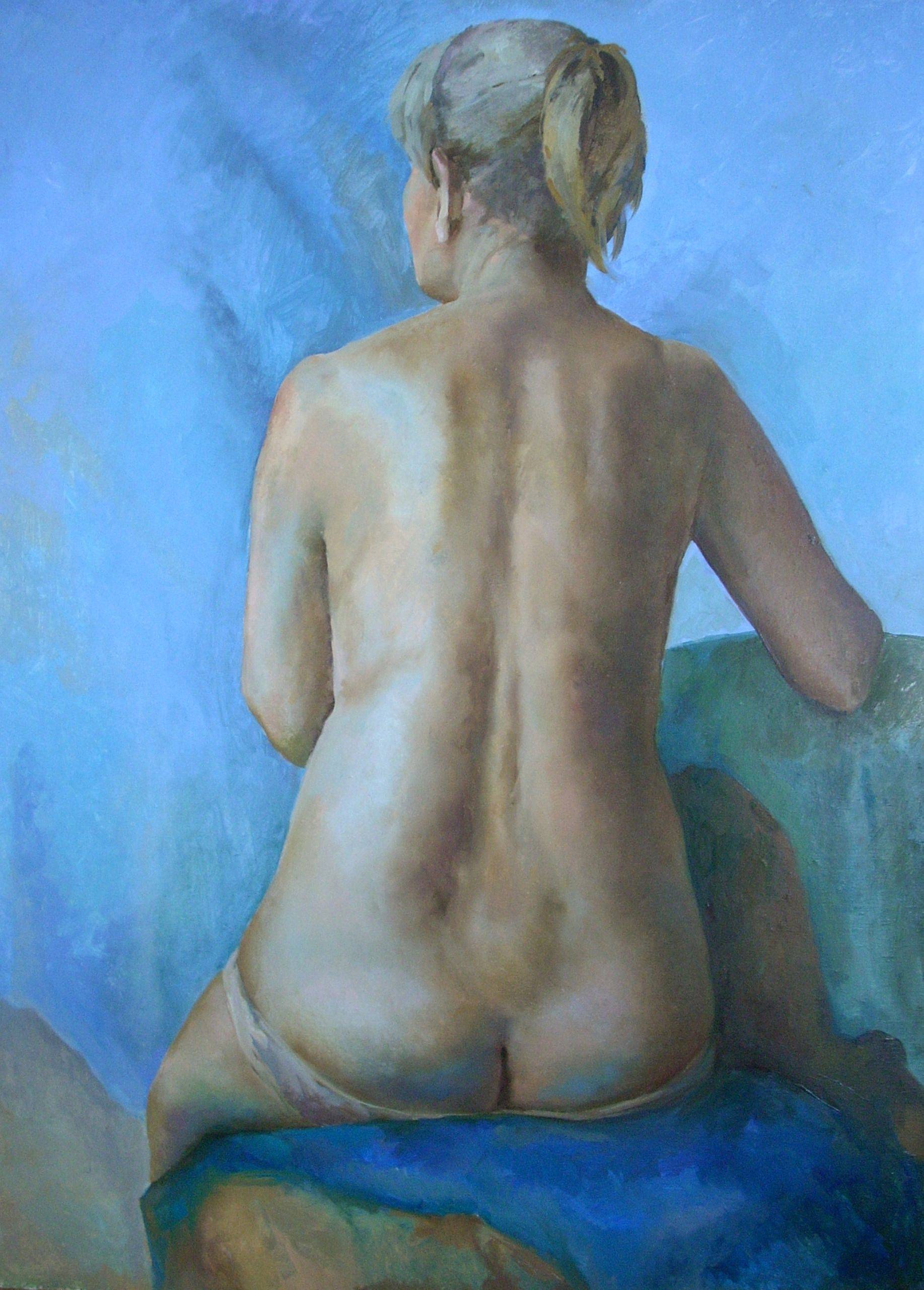 Obraz ukazuje subtelną paletę barw, dominują odcienie błękitu i cielistego różu, co nadaje mu delikatności i spokoju. Kształt postaci jest miękki, zaokrąglone linie kontrastują z ostrzejszymi, geometrycznymi krawędziami tła. Całość tworzy harmonijną kompozycję, skupiając się na centralnej sylwetce. Atmosfera jest niemal medytacyjna. Obraz emanuje ciszą, jakby zatrzymał chwilę intymnego zamyślenia. Jest w tym jakaś nostalgia, może odrobina melancholii, która przyciąga wzrok i budzi refleksje. Styl obrazu wskazuje na klasyczną technikę malarską z finezyjnym podejściem do detali. Więc jakie emocje to wywołuje? Dla mnie to jest prawdziwe "wow". Ciepło, intymność, trochę jak wspomnienie letniego popołudnia. Użycie światła i cieni subtelnie rzeźbi postać, prawie można poczuć teksturę skóry. Gdy patrzę na ten obraz, myślę, że to miejsce, gdzie czas się zatrzymał. Chciałbym tam być, w tej chwili, w tej ciszy. Patrząc, można poczuć się, jakbyś był częścią czegoś większego - może echo codzienności, może cisza przed burzą. To jest beautiful, naprawdę.