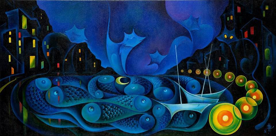Obraz tętni kolorami nocy, przyciągając wzrok intensywnym błękitem i fioletem, przeplatanym zielonymi i żółtymi akcentami. Kształty są faliste, przypominają wirujące wody, które zdają się tańczyć w księżycowym blasku. Mrok budynków w tle jest delikatnie rozświetlony żółtymi oknami, jakby wśród nich tliło się ciche życie. Kompozycja ma w sobie coś z marzenia sennego, trochę jakby z baśniowej krainy. Atmosfera? Tajemnicza i spokojna, jakby świat właśnie zasnął, a my mogliśmy go zobaczyć w jego ukrytej, magicznej postaci. Artystycznie, dzieło eksploruje techniki impresjonizmu z nutą surrealizmu, mieszając swobodę form ze szczegółowością. Emocjonalnie, obraz wyzwala uczucie spokoju, może nawet zew przygody. Jakby oto zaraz coś miało się wydarzyć. Może tam jest statek kosmiczny, mamo! – powiedziałoby dziecko, dostrzegając w kształtach coś niezwykłego. Te kręgi i fale, trochę jak woda, trochę jak sen, budzą w nas ciekawe interpretacje. Widz może zastanawiać się, czy to metafora wewnętrznego spokoju, czy może podróż w nieznane. Osobiście, oglądając ten obraz, czuję się, jakbym zaszedł do innego świata. Trochę mysterious, trochę spokojny. Zastanawia mnie, co artysta chciał przez to powiedzieć, ale też miło, że każdy może zobaczyć coś własnego.