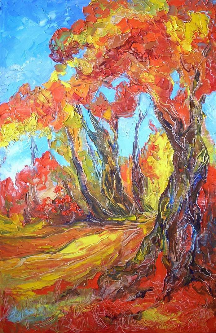 Ten obraz to prawdziwa eksplozja kolorów. Jasne, żywe czerwienie i pomarańcze liści biją po oczach, podczas gdy niebo jest błękitne jak w letni dzień. Drzewa pląsają ku górze, wirującymi, niemal tanecznymi grubymi pociągnięciami pędzla. Kompozycja kieruje wzrok ku horyzontowi, gdzie zlewają się różne odcienie – od delikatnych zielonych po głębokie brązy. Styl tego dzieła jest bardzo ekspresyjny, przypomina swirling paintbrush effect, który dodaje dynamizmu. Atmosfera jest pełna energii, jakby zapraszała do tańca wśród opadających liści. Czuję, jakby obraz uśmiechał się do mnie, emanując radością i ciepłem jesieni. Artysta użył grubych warstw farby, co daje fakturę niemal rzeźbiarską. To zachęca do dotknięcia płótna, by poczuć ten materiałowy wymiar sztuki. Obraz wywołuje we mnie uczucie zachwytu nad pięknem natury. Przypomina mi dni, gdy jako dziecko biegałem po parku, kopiąc stosy liści w powietrze. "Liście są jak ognie na niebie!" powiedziałby pewnie brzdąc. Bez względu na to, jak go odbierasz, to dzieło ma w sobie coś magicznego, co sprawia, że czas się zatrzymuje. Czy to nie jest piękne?