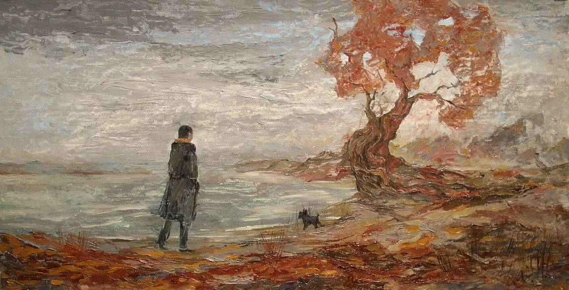 Na obrazie widzimy samotną postać stojącą nad brzegiem jeziora. Ubrana w ciemny płaszcz, wydaje się zatopiona w myślach. Po jej lewej stronie nieco nieregularne drzewo o przepięknych rudawych liściach, które dodają życia całej kompozycji. Kolory są stonowane, dominują odcienie szarości i brązu, co podkreśla melancholijny nastrój. Obraz emanuje spokojem, ciszą, a jednocześnie pewną tajemniczością, która przyciąga wzrok. Płótno przypomina styl impresjonistyczny dzięki widocznym śladom pędzla, które dodają tekstury i dynamiki. Artysta z wielką finezją uchwycił emocje zamyślenia i introspekcji. A co widzi piesek? może coś fajnego! Ten obraz może wzbudzać refleksję nad samotnością, przemijaniem czasu i rozmyślaniem nad sensem życia. Tekstura powierzchni jest niemalże palpable, co dodaje mu wyjątkowej fizyczności. Patrząc na tę scenę, czuję się niemal przeniesiony do innego świata. Takiego trochę nostalgic, gdzie wszystko jest możliwe. To swoiste okno do duszy, które pozwala zajrzeć głęboko w siebie.